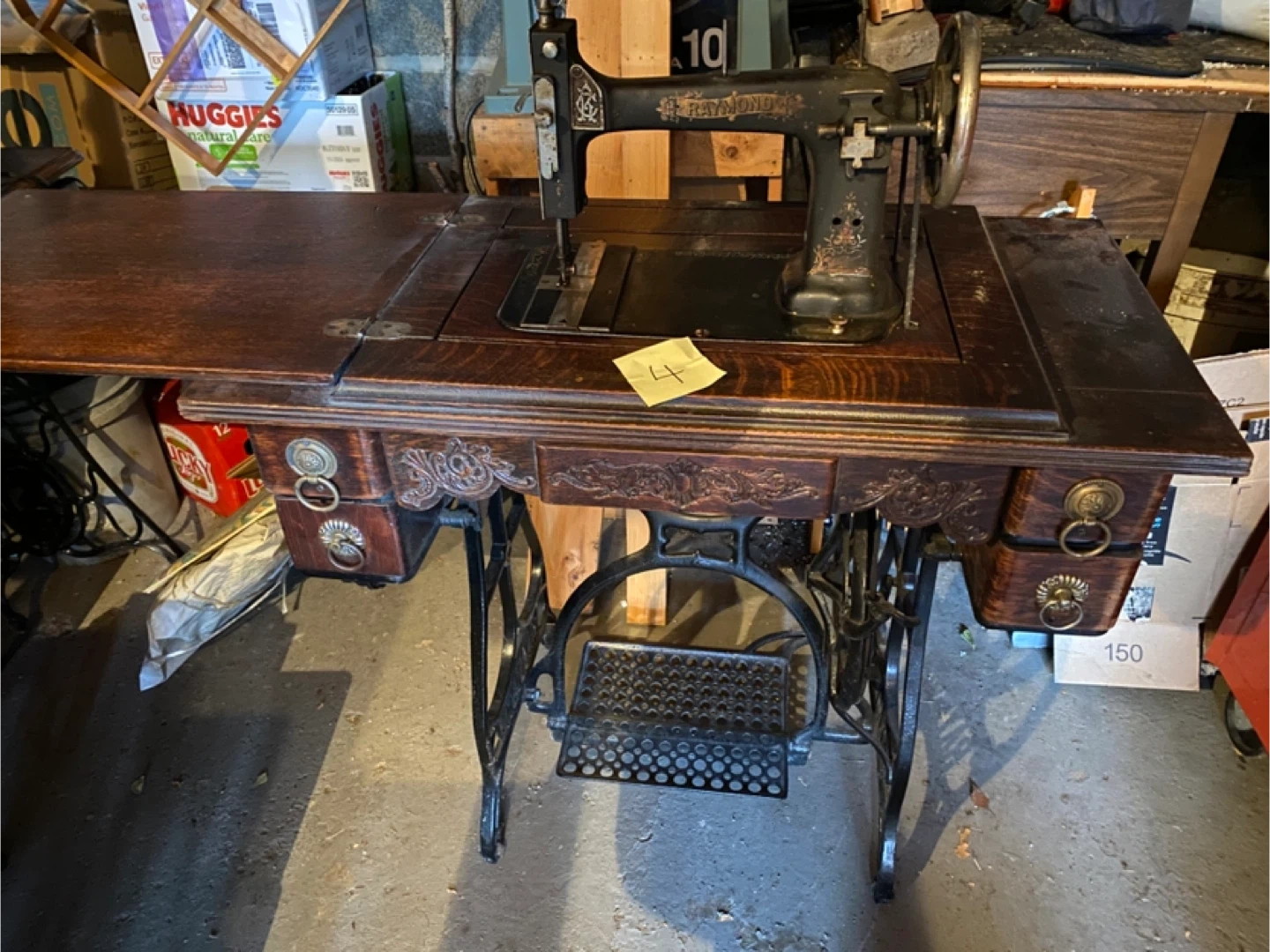 Selling an antique Raymond sewing machine. It features a beautiful, ornate design on the table and drawers. A great piece for collectors or those looking for a unique vintage item!