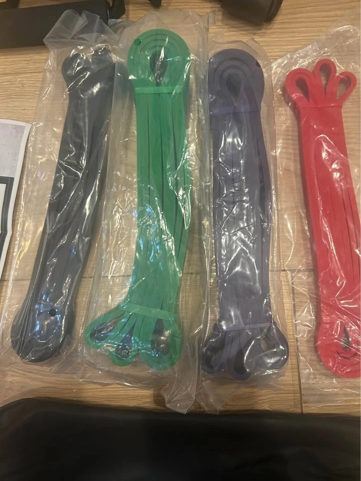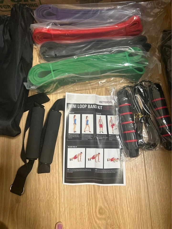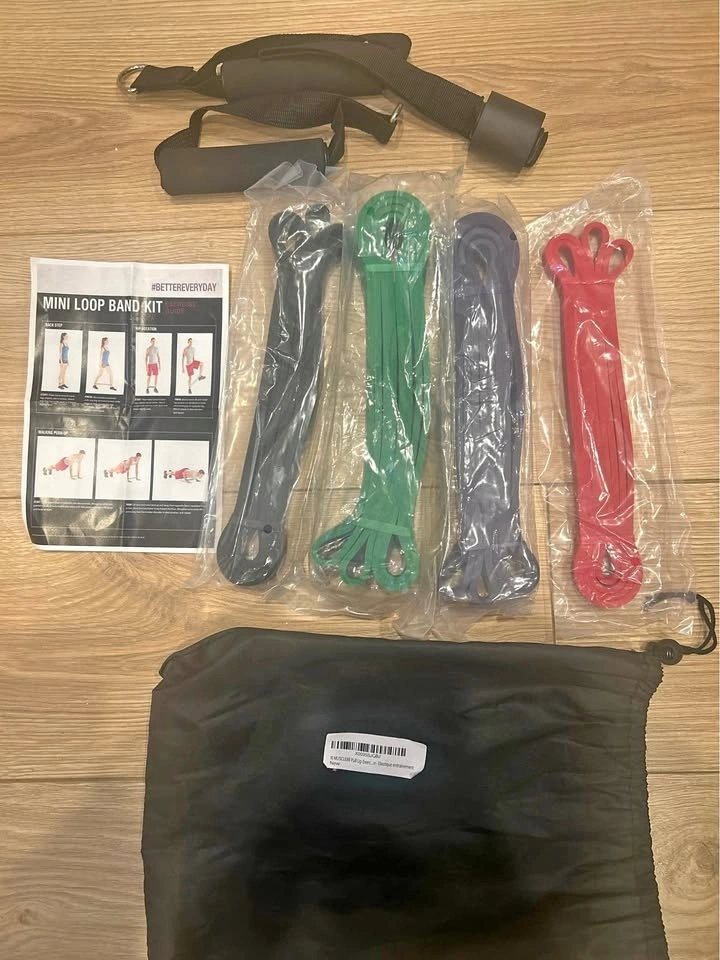 Bag of 4 different strengths resistance band loops comes in bag with handles and door anchor and also a skipping rope. Also includes some exercises that can be performed with them.