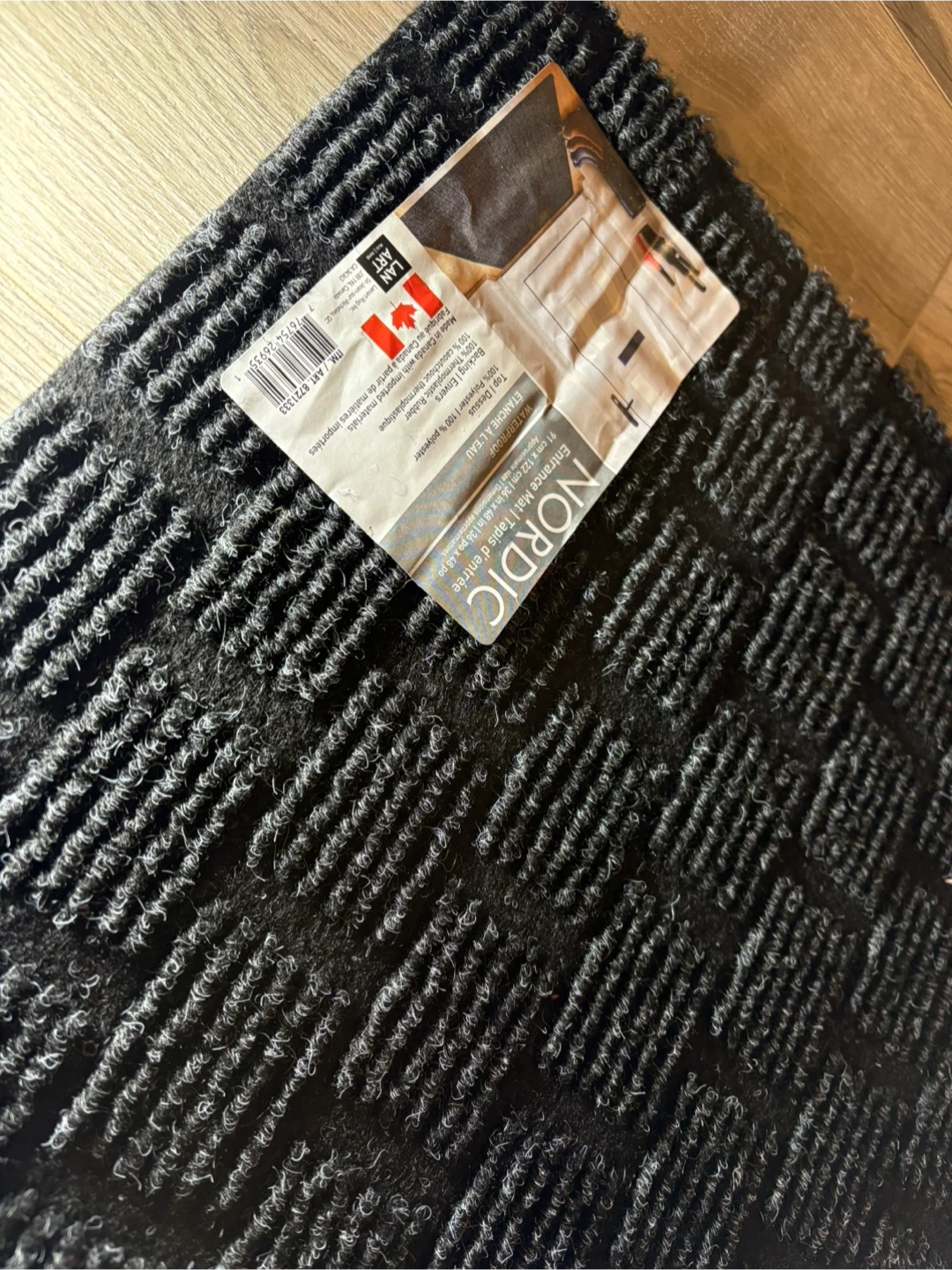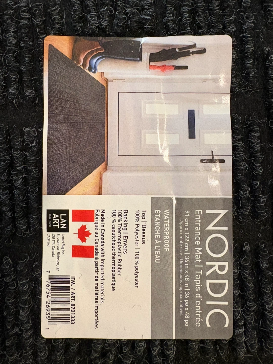 Selling a brand new Nordic entrance mat! It measures approximately 91 cm x 122 cm (36 in x 48 in). The top is 100% polyester, and the backing is 100% thermoplastic rubber. This mat was made in Canada with imported materials and is waterproof
