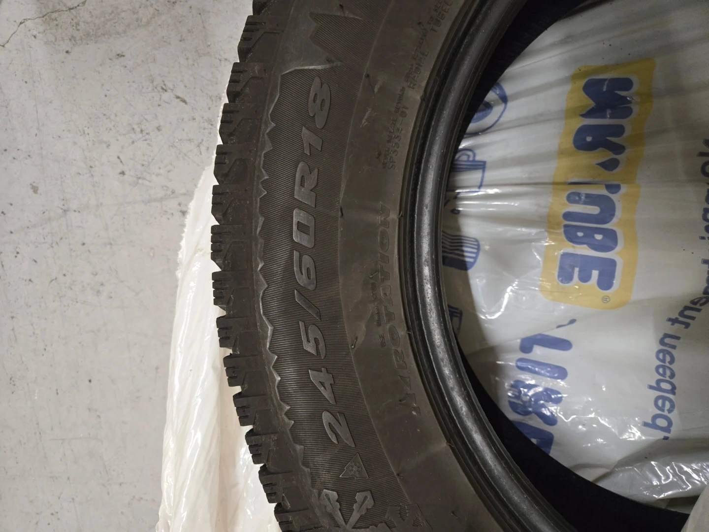 Selling a studded winter tire in size 245/60R18. It's ready to provide excellent traction in snowy and icy conditions. The tire is marked with 'M+S' indicating its suitability for mud and snow. It also has 'USE 10mm STUD'.