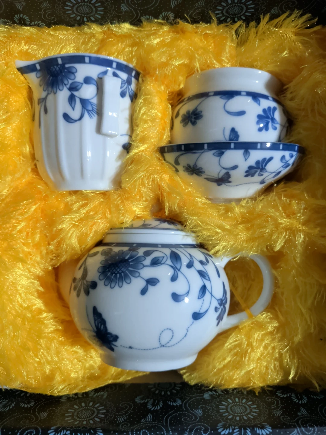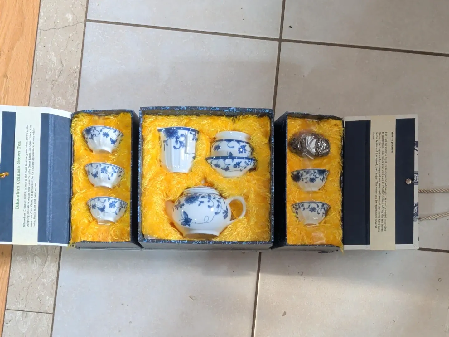 Selling a beautiful Biluochun Chinese Green Tea set! It includes a teapot, cups, and other accessories, all neatly arranged in a box. The set features a lovely blue and white floral design. Perfect for tea lovers! Also comes with Green Tea.