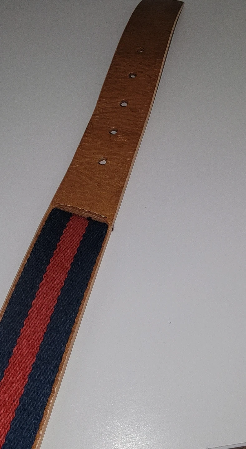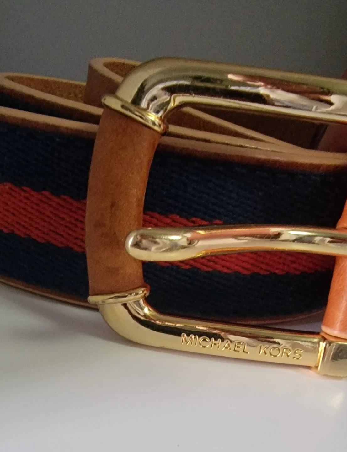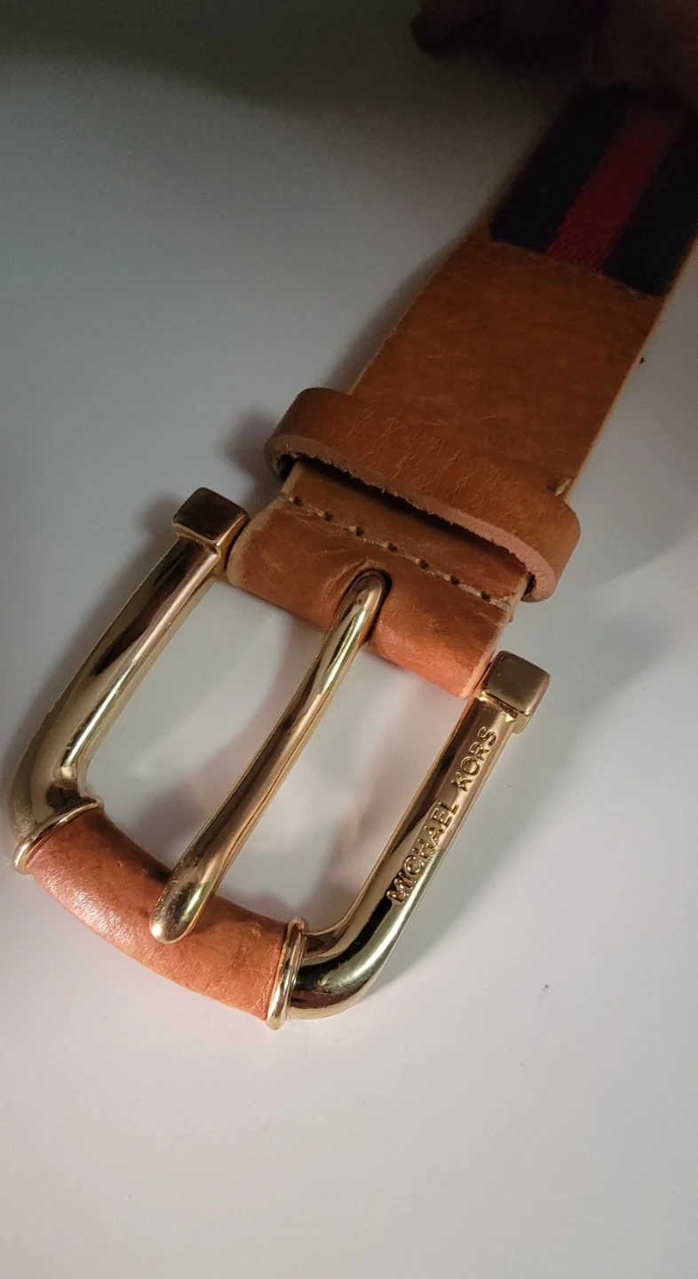 Selling a Michael Kors belt with a stylish striped design! The belt features a gold-tone buckle and a combination of leather and fabric materials. It's in great condition and ready to accessorize your outfits
