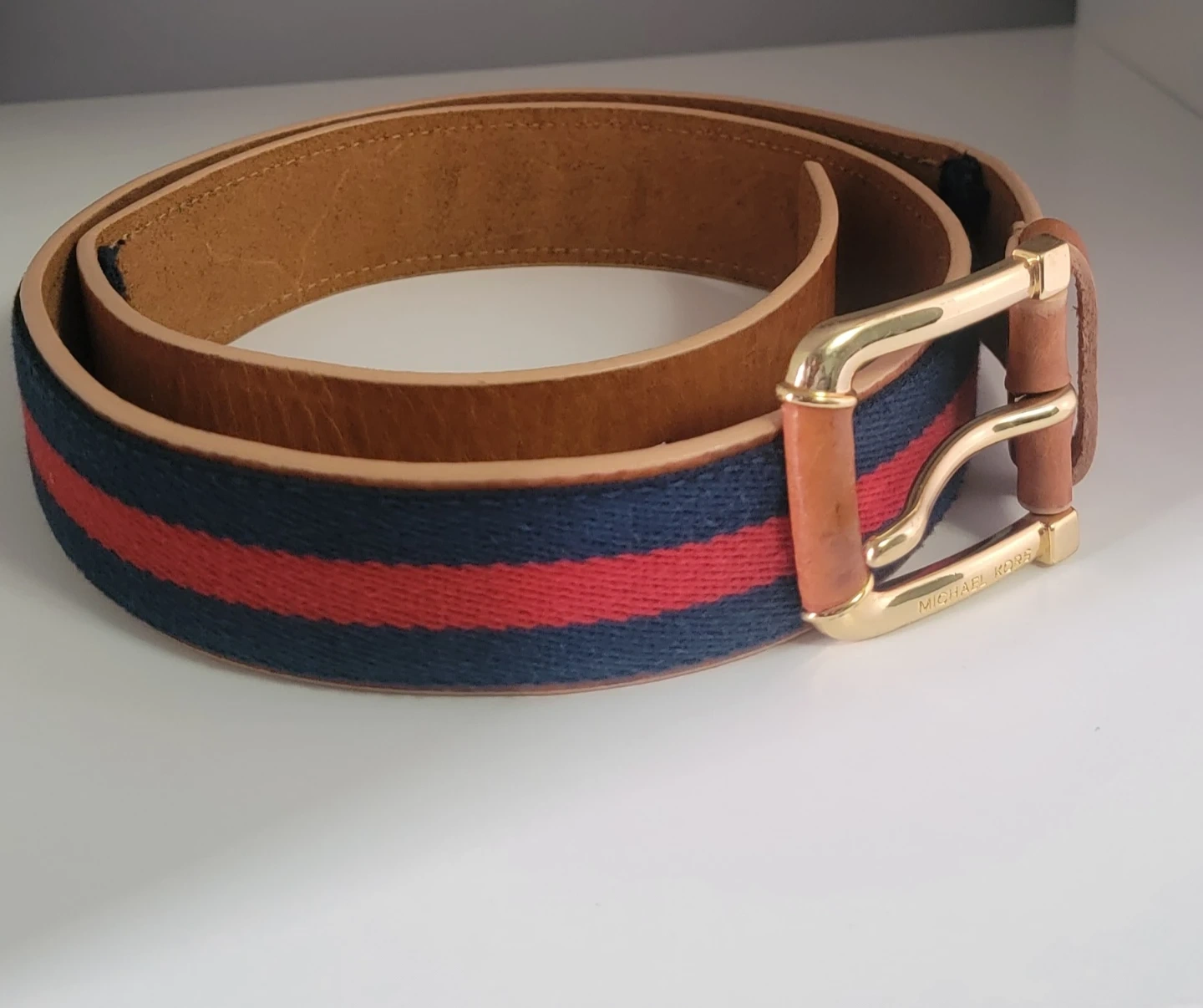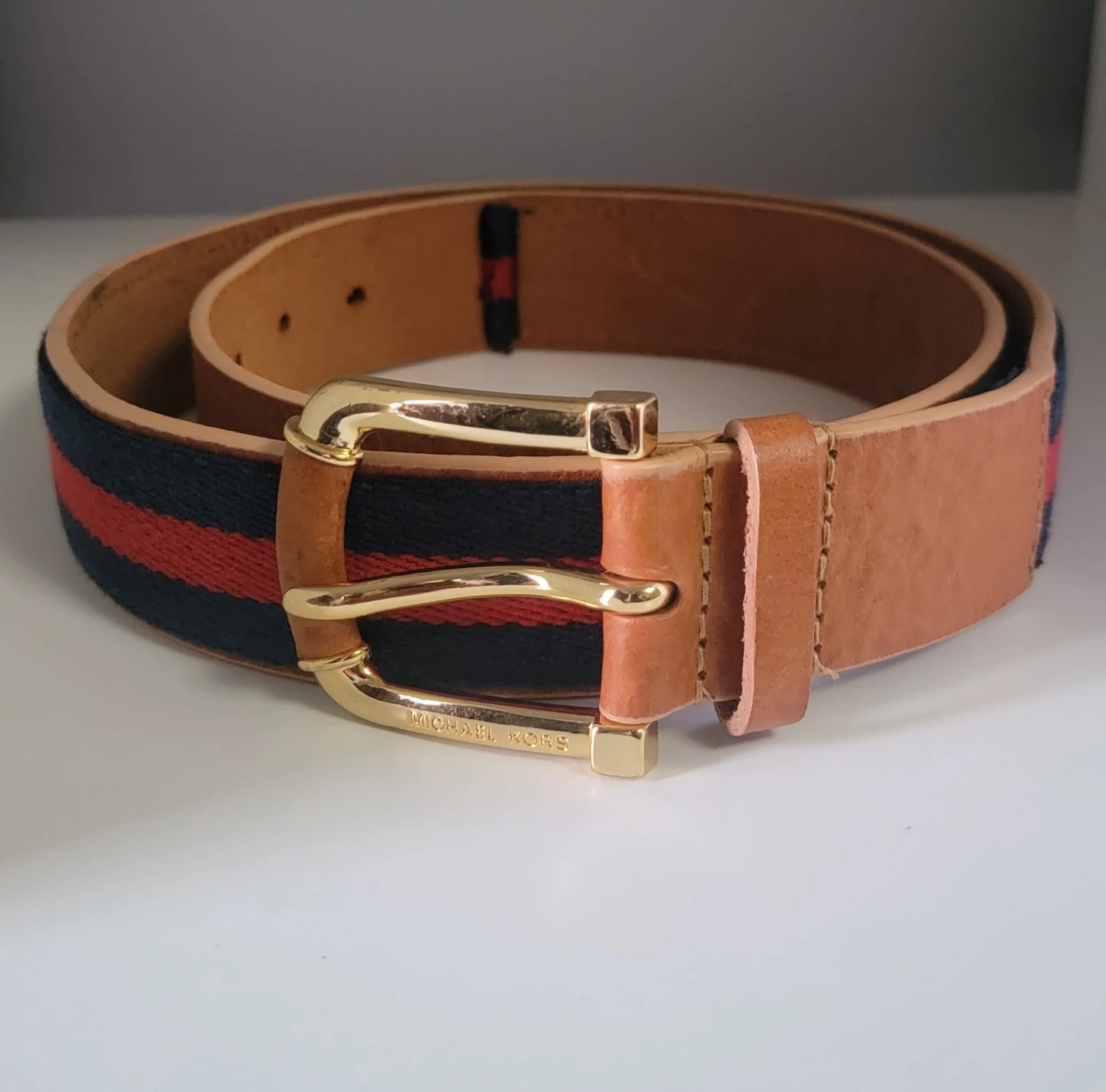 Selling a Michael Kors belt with a stylish striped design! The belt features a gold-tone buckle and a combination of leather and fabric materials. It's in great condition and ready to accessorize your outfits