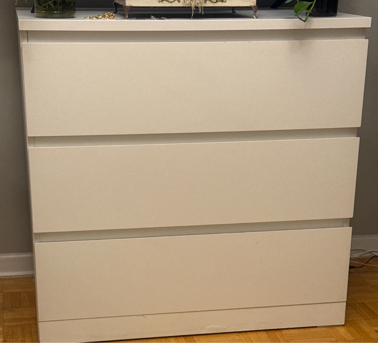 Selling a simple white dresser with three drawers. It's perfect for extra storage in a bedroom, closet, or any living space. There are some signs of use on the bottom.