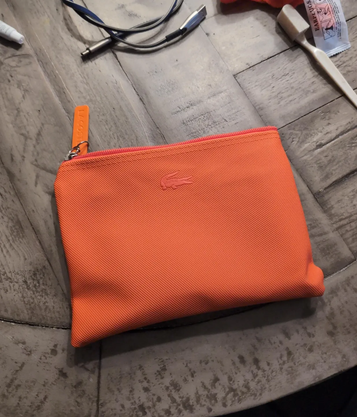 Selling a vibrant orange Lacoste pouch! It's in great condition and perfect for carrying your essentials. The material has a nice texture, and the iconic Lacoste logo is subtly displayed. A stylish and practical accessory!