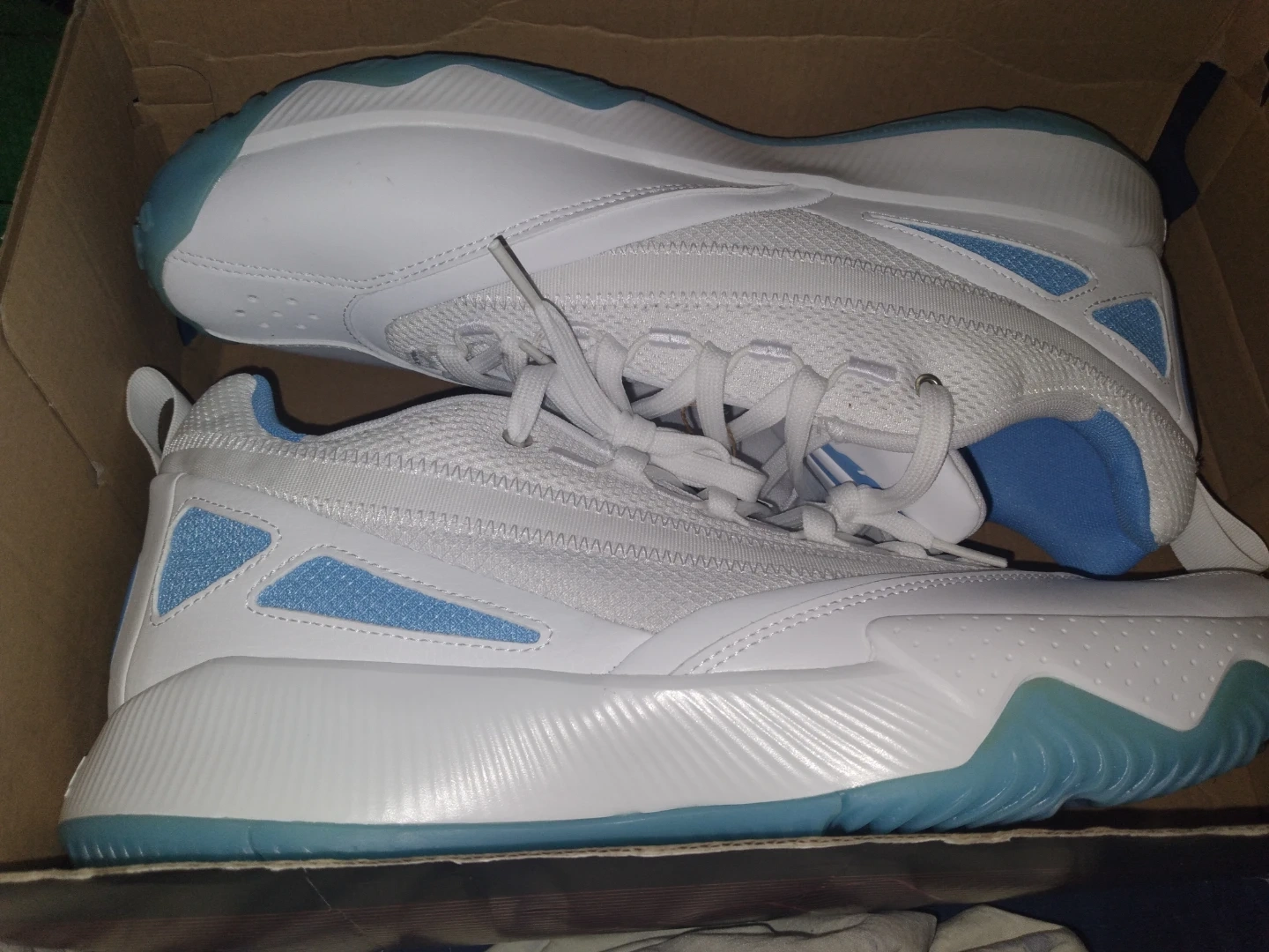 Selling a pair of Adidas Dame D Bounce basketball shoes. They come in a white and light blue colorway and include the original box. These shoes are perfect for hitting the court!