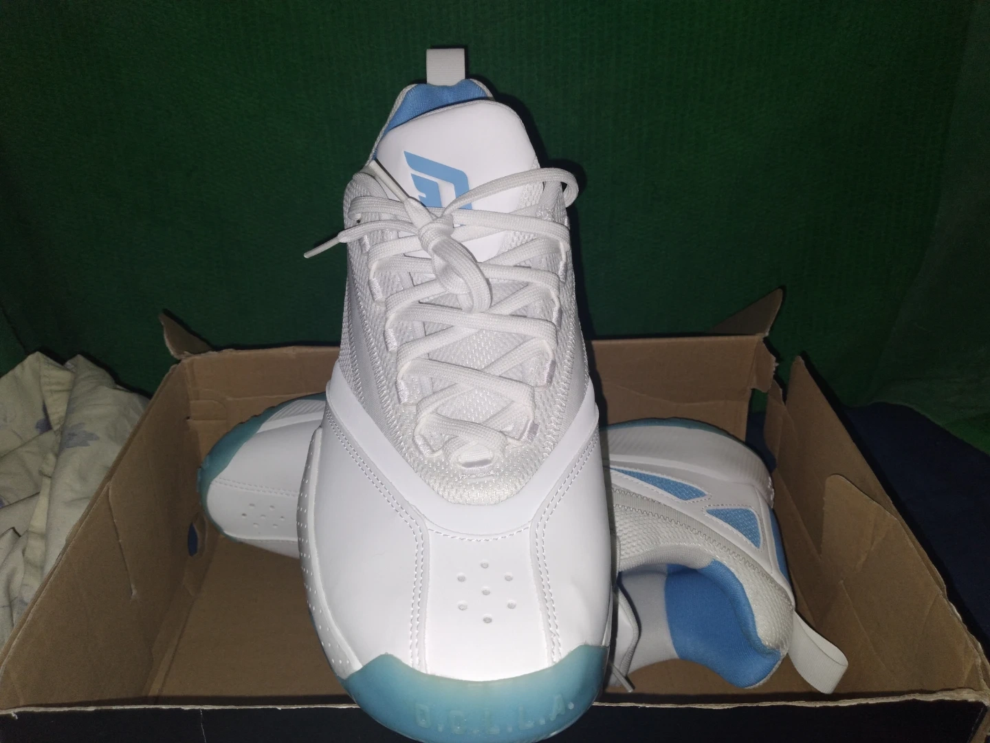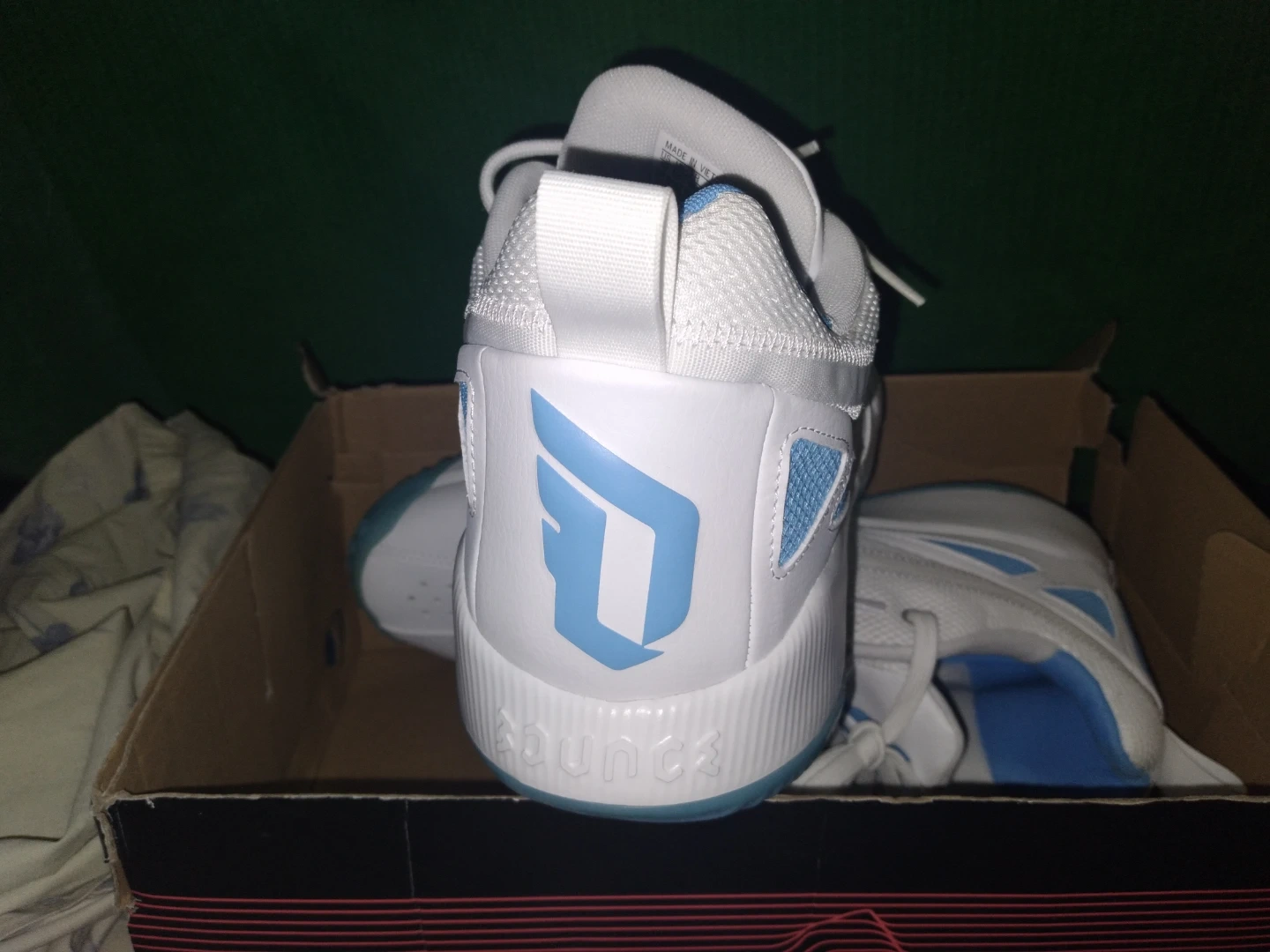 Selling a pair of Adidas Dame D Bounce basketball shoes. They come in a white and light blue colorway and include the original box. These shoes are perfect for hitting the court!