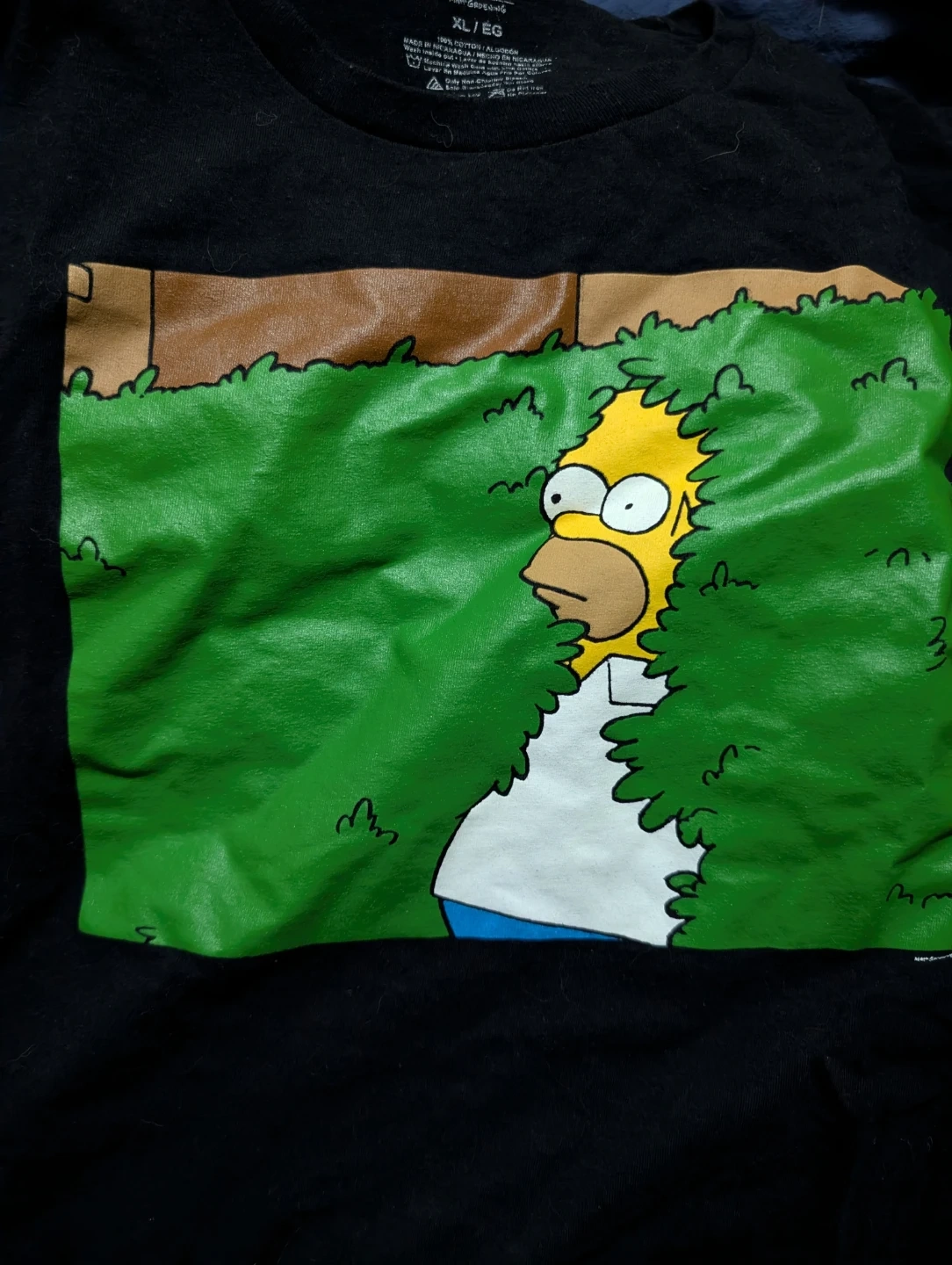 Selling a gently used Simpsons t-shirt featuring Homer Simpson peeking through the bushes! It's a size XL and made of 100% cotton. Barely worn. Will lint roll it for you!
