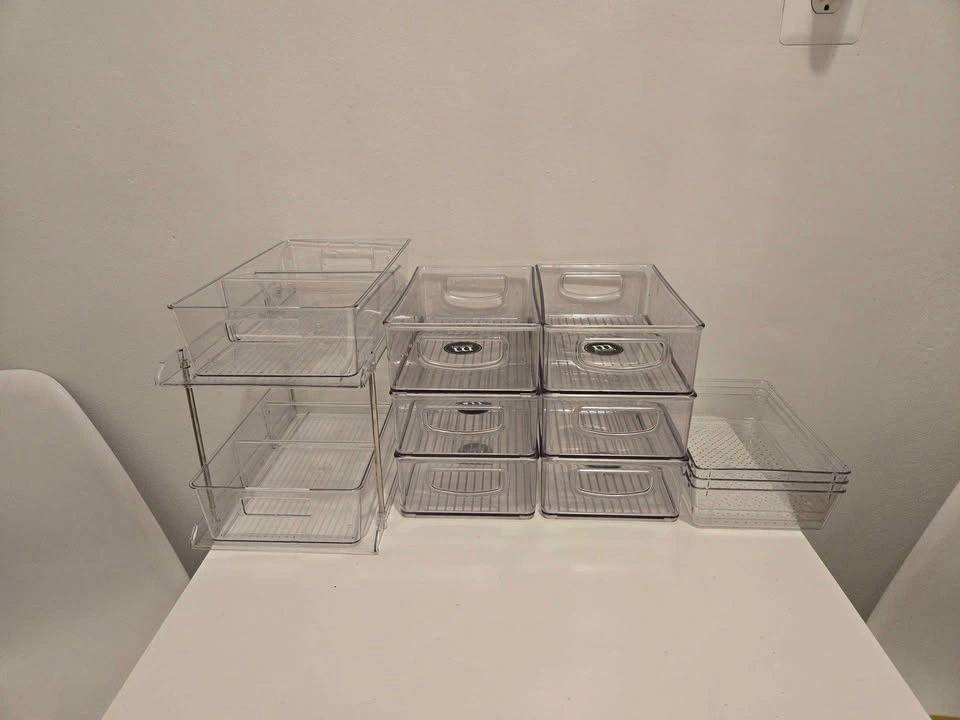 Set of clear plastic drawer organizers in different sizes. Great for kitchen, pantry, fridge, bathroom, or office organization. All in excellent condition.