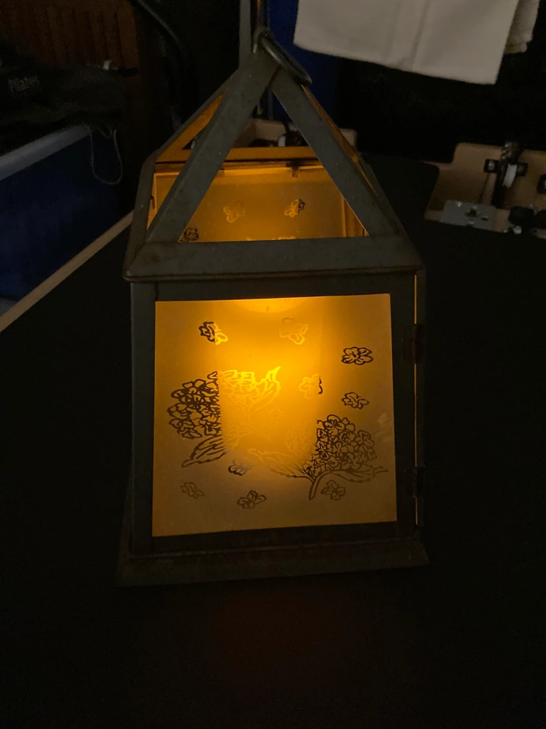 This is a charming decorative outdoor metal lantern that casts a warm, inviting glow. It features a lovely floral design on the glass panels, perfect for your garden.
