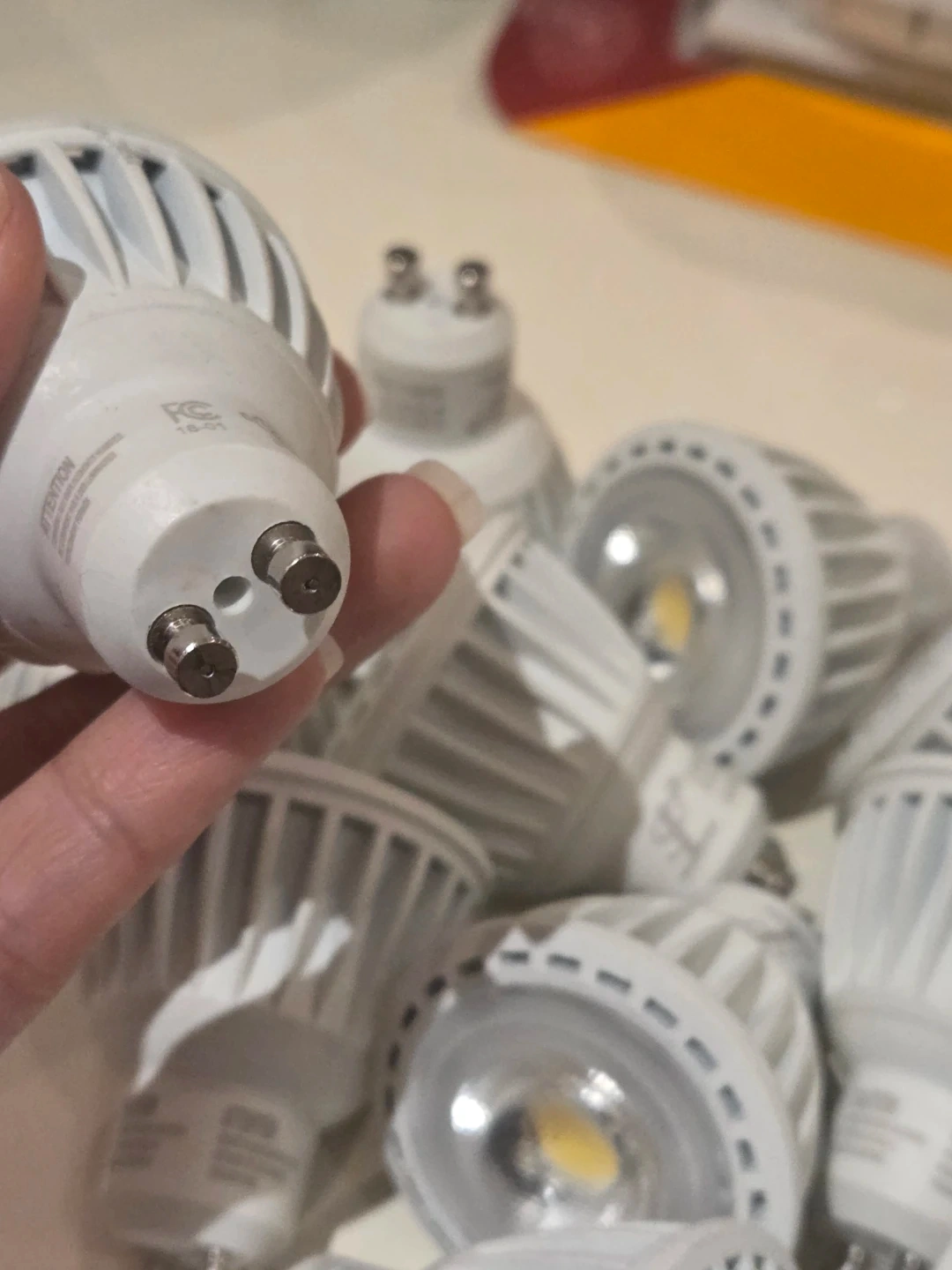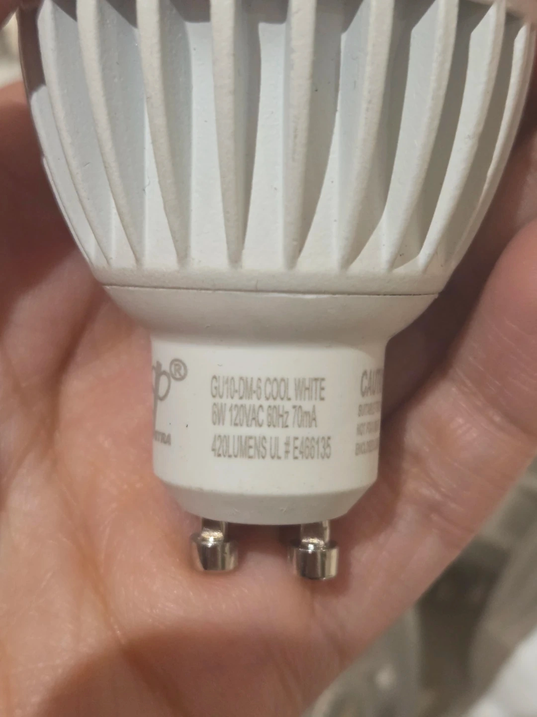 SunPetra GU10-DM-6 LED light bulbs. They're cool white. Each bulb is 6W, 120VAC 60Hz 70mA, and 420 Lumens.