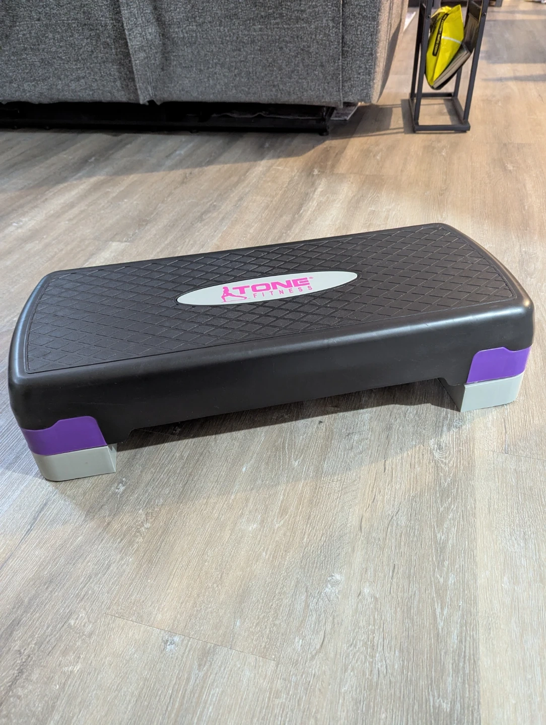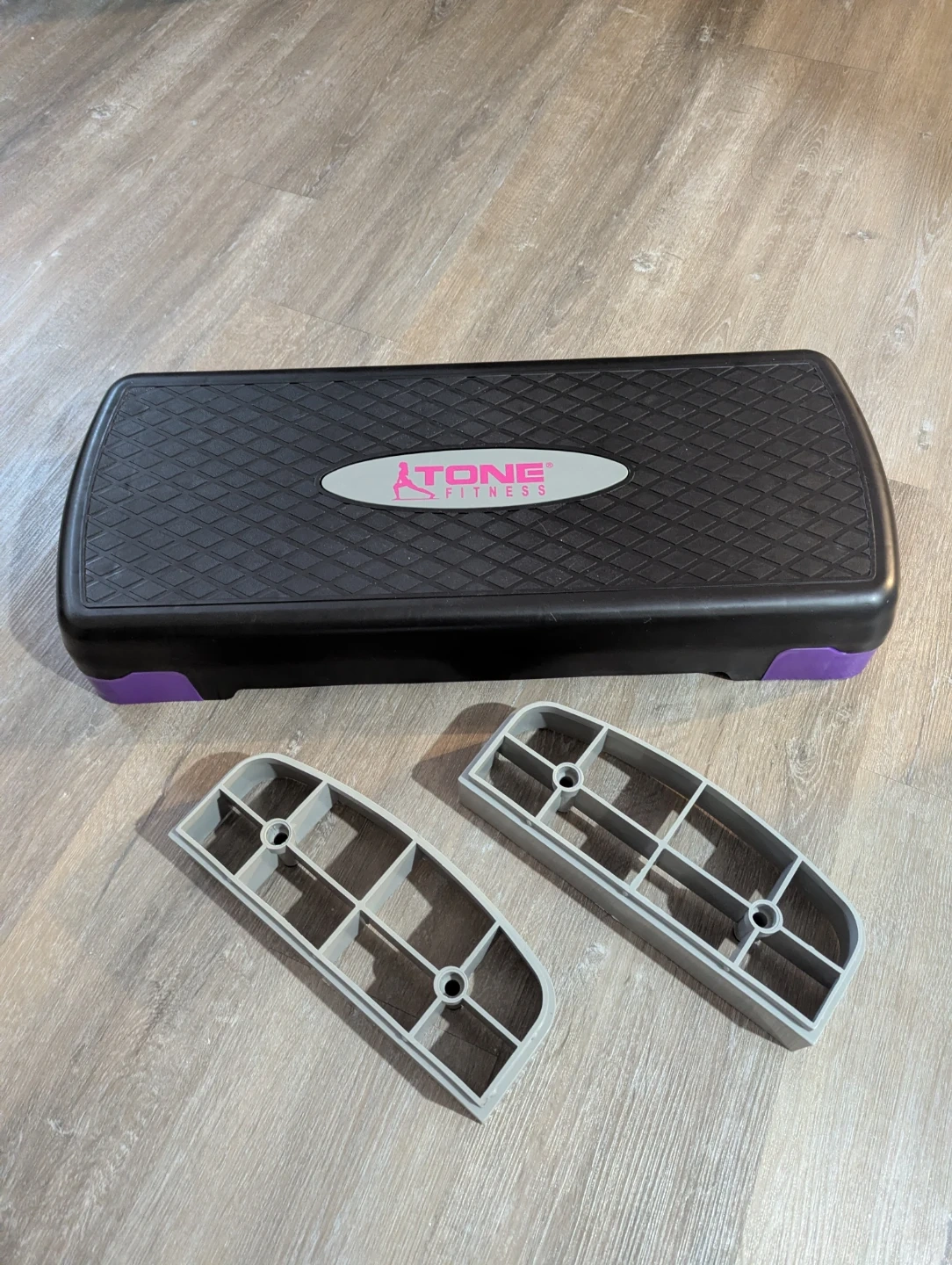 It's in great shape and ready for your home workouts. The step includes two risers of 4in or 6in so you can adjust the height to your liking and non slip surface.