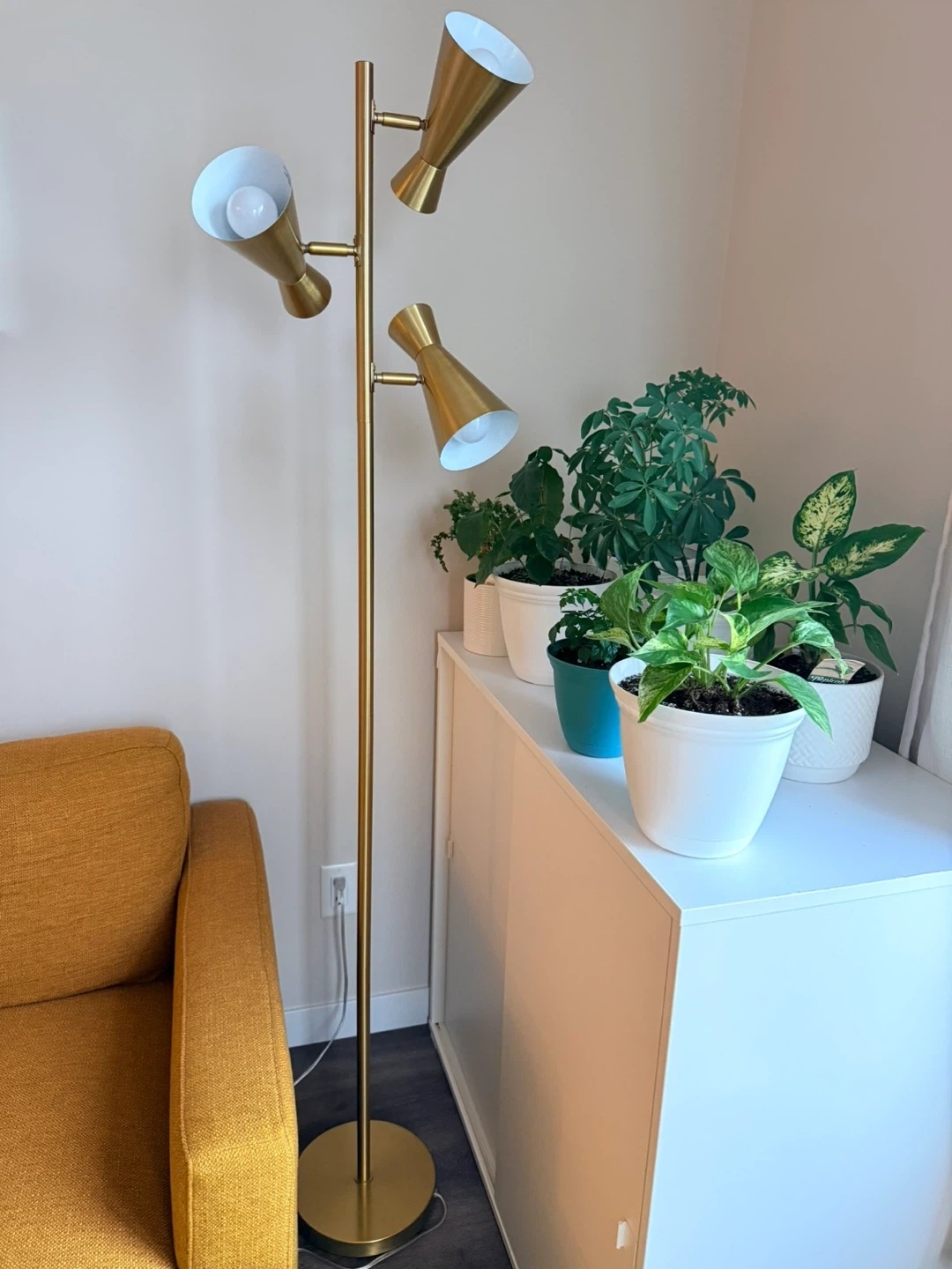 Selling a stylish floor lamp with a gold finish! It has a tripod design and would look great in any living room or bedroom.
