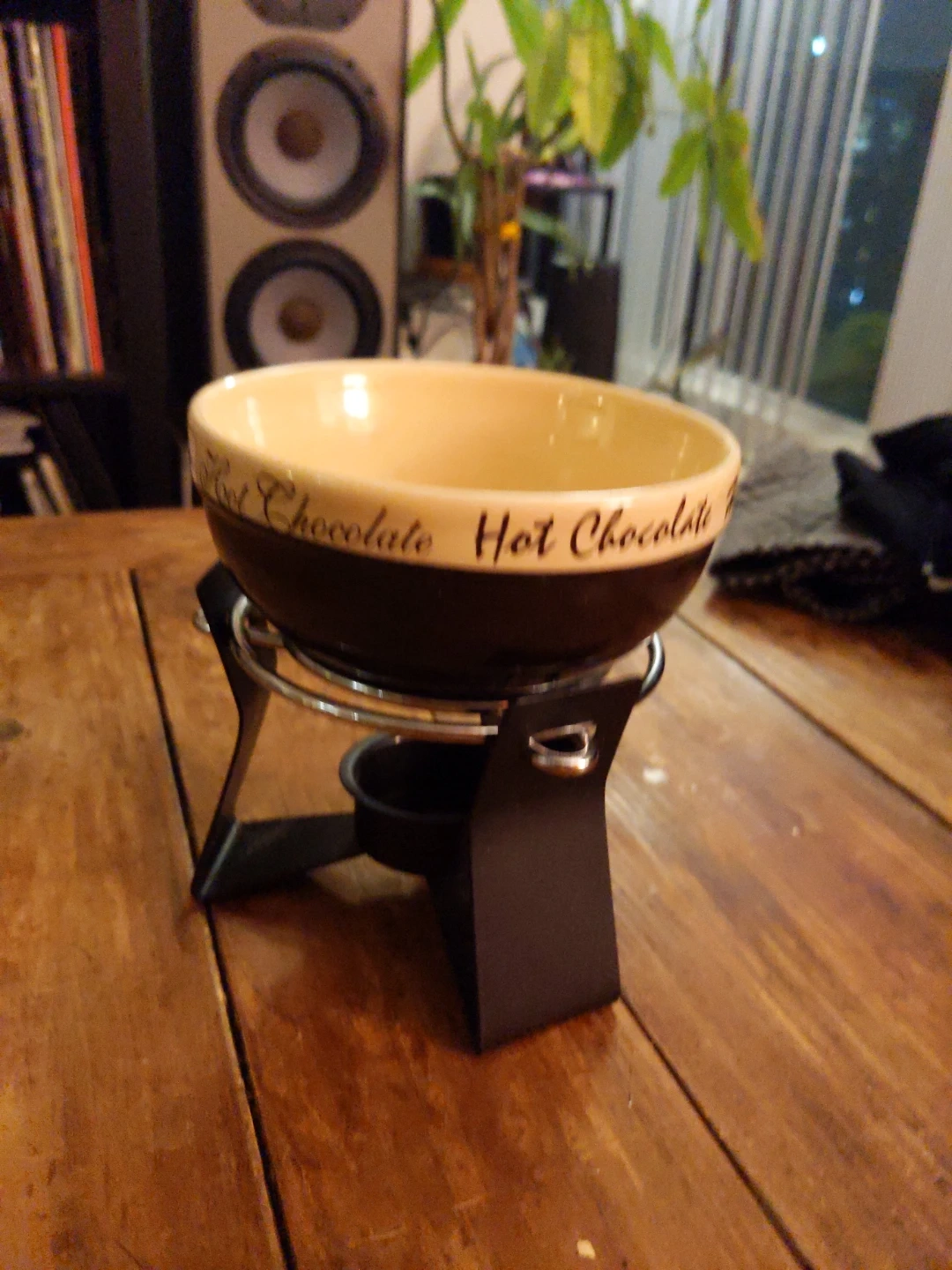 Get ready for some cozy nights with this chocolate fondue set! It features a ceramic bowl with "Chocolate Hot Chocolate" written around the rim, a metal stand, and a tea light holder. Perfect for melting chocolate and enjoying a sweet treat with friends and family