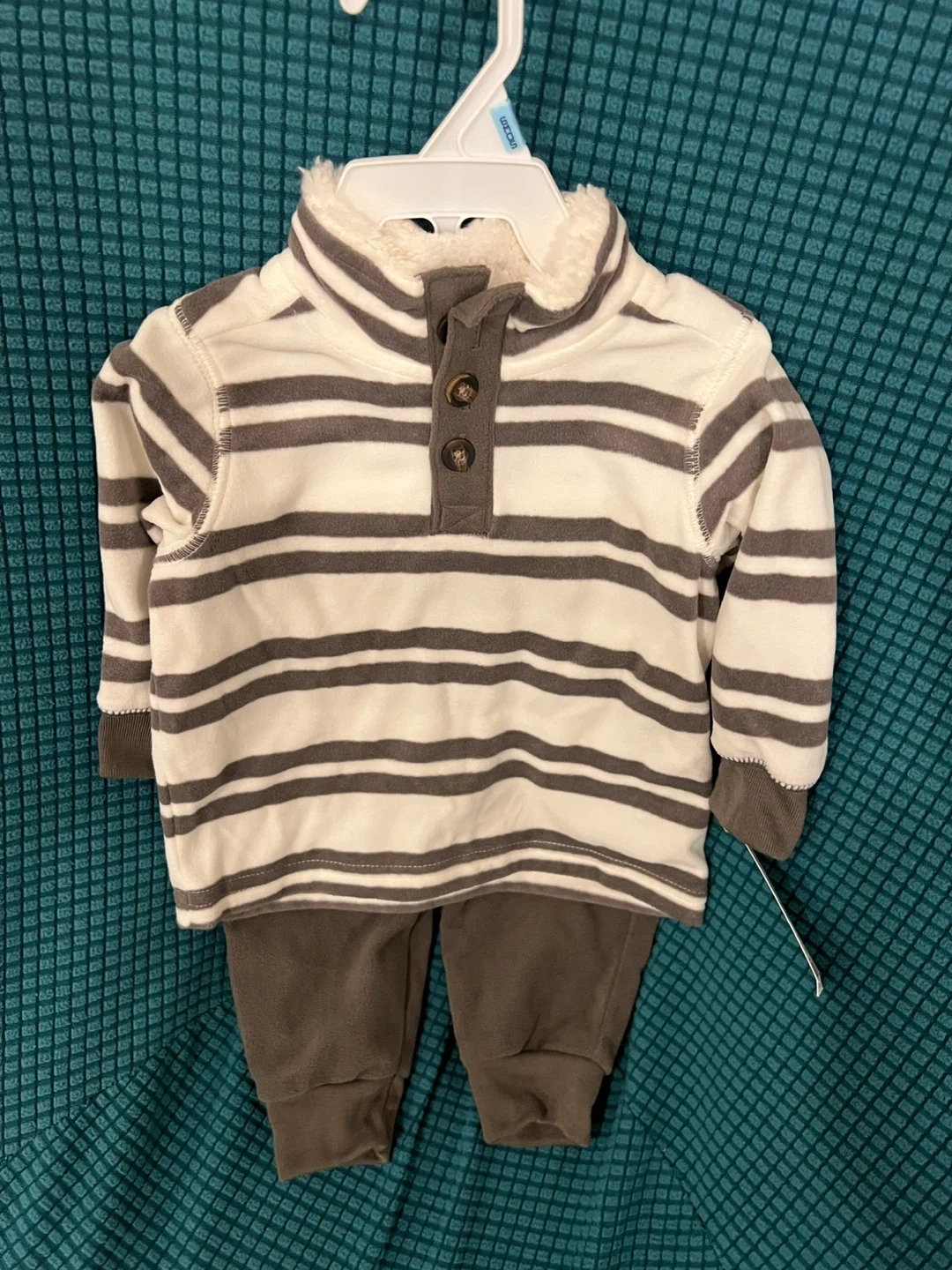 A cute and cozy striped baby outfit, perfect for keeping your little one warm! This set includes a long-sleeved top with a button-up neck and matching pants. The material is soft and gentle on the skin, making it ideal for everyday wear