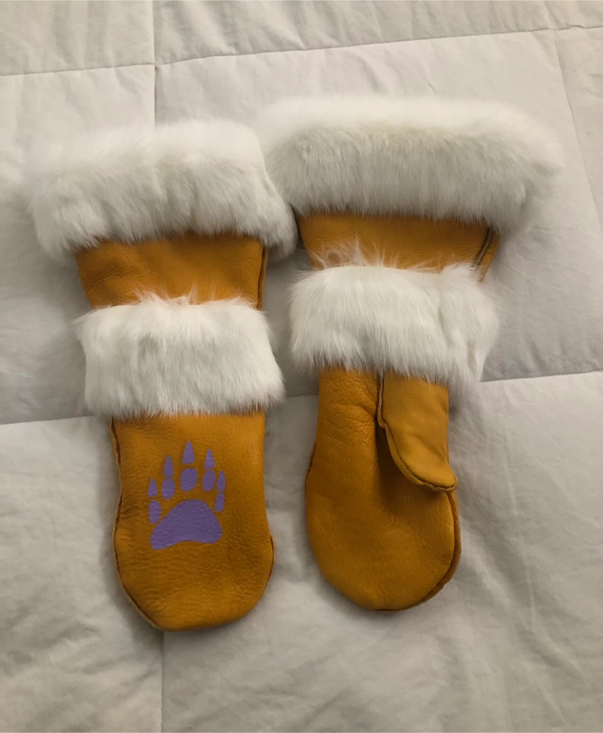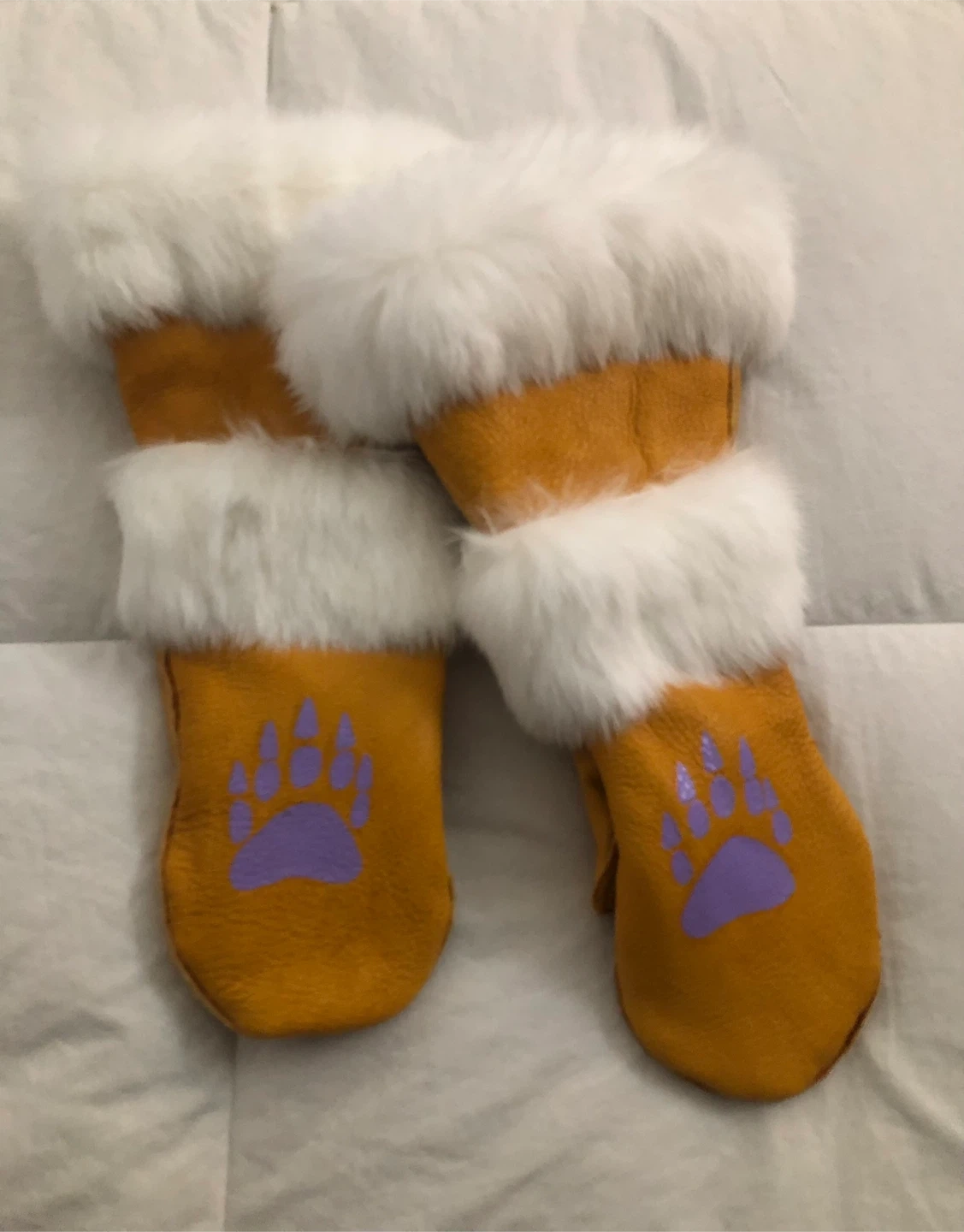 These are a pair of handmade leather gauntlets in a soft Elk hide, adorned with a white Rabbit fur trim. Bear Paw print design in mauve; representing one of the 7 Teachings: Courage. They are handmade, Indigenous created from the Dakota and Ojibway tribes.