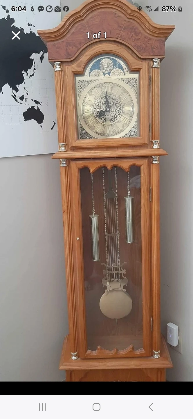 Selling a grandfather clock with a beautiful oak wood finish! It features a classic design with a detailed clock face and pendulum. This clock would make a great addition to any home!