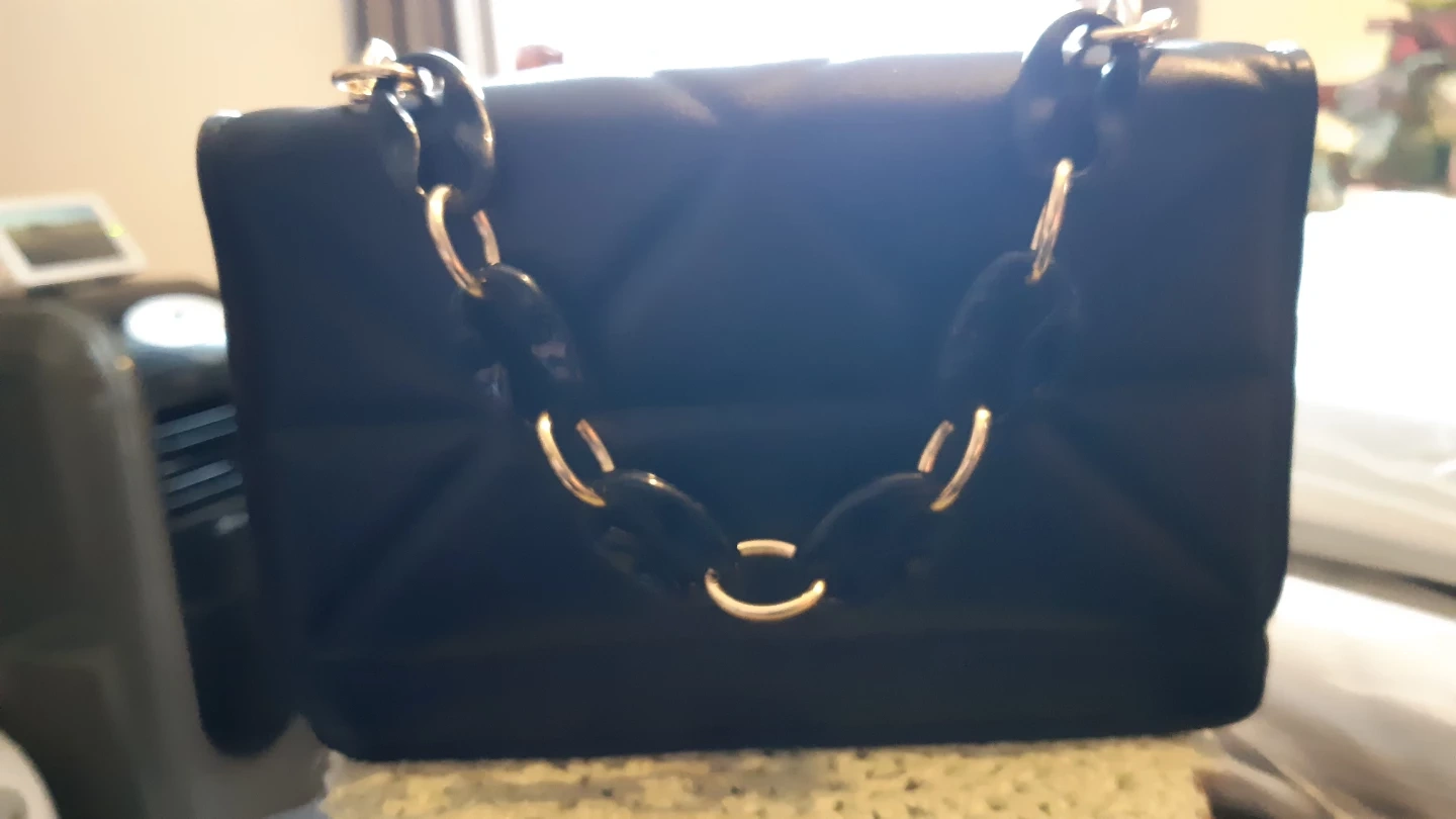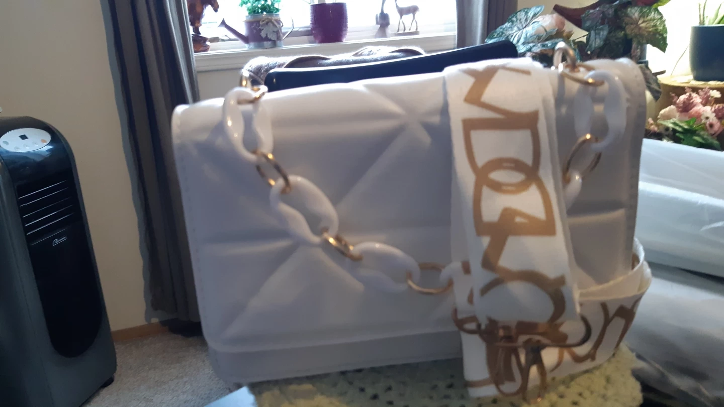 Small purse. Hand strap or adjustable shoulder strap. Brand new. White or black. 8" wide 6" tall. Comes with matching removeable zippered pouch.