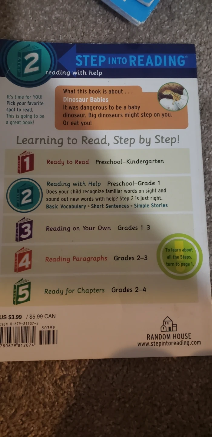 Selling a Step Into Reading book titled Dinosaur Babies! It's part of the Learning to Read, Step by Step! series. This book is designed for Preschool-Kindergarten level, perfect for helping your child recognize familiar words and sound out new words. A great spot to read!