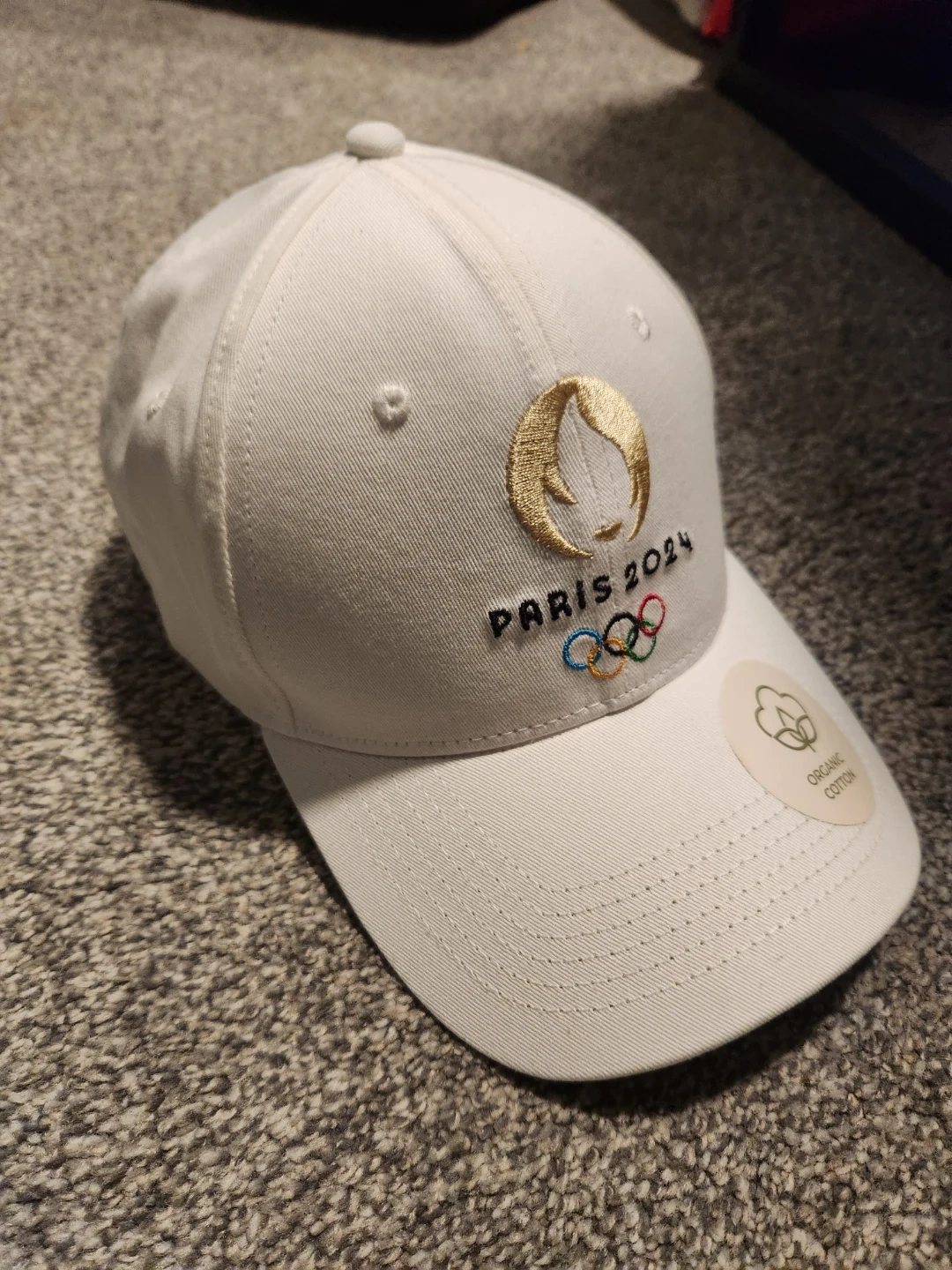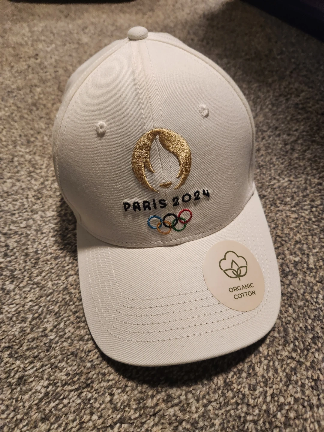 Selling a white baseball cap from the Paris 2024 Olympics. It features the Paris 2024 logo and is made of organic cotton. A great souvenir!
