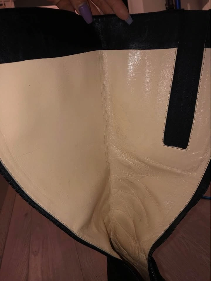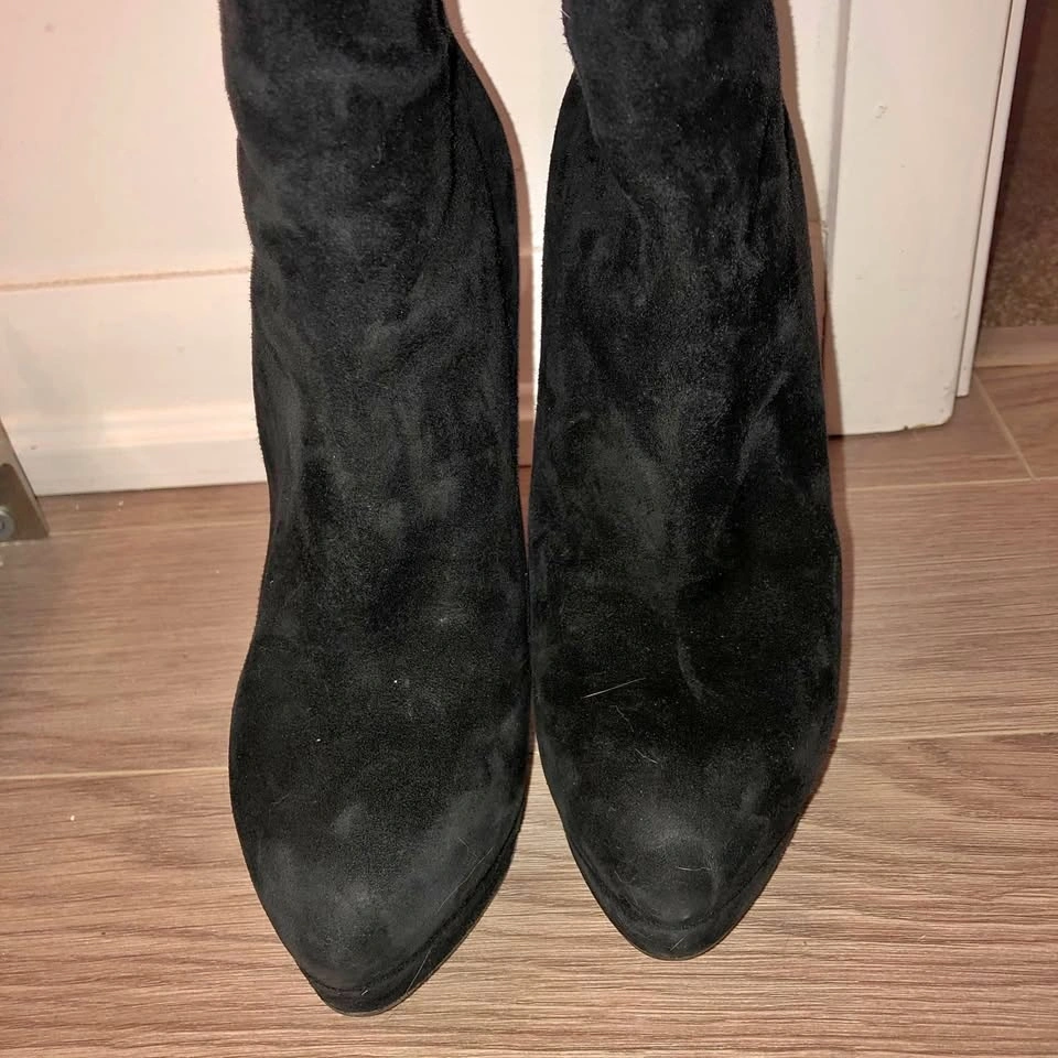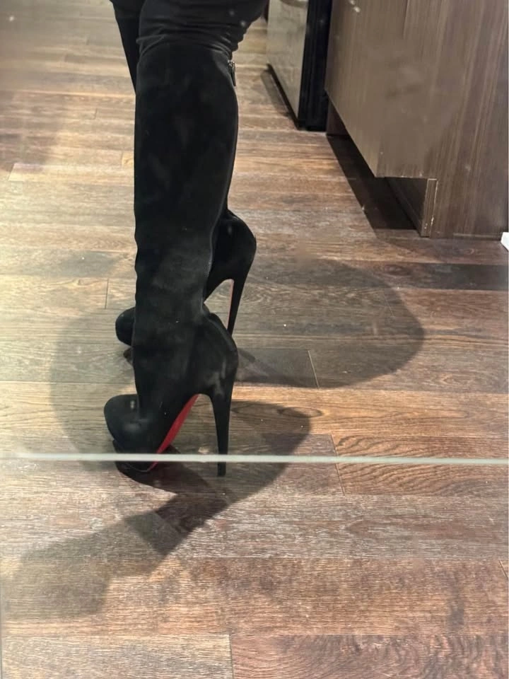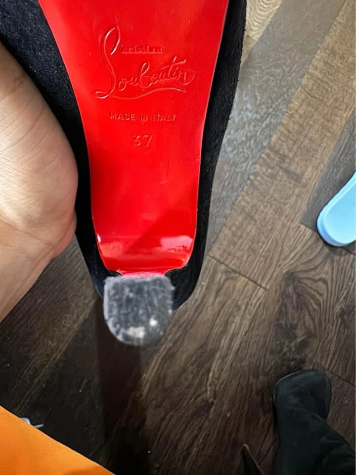 Perfect for skirt season with boots. Sits just under your knees. Size 37. Well used, no box. Prestine interior, no smell. Both heels are worn, you will have to get them repaired. Red sole protector on since day 1. It’ll be like new once you have heels repaired.