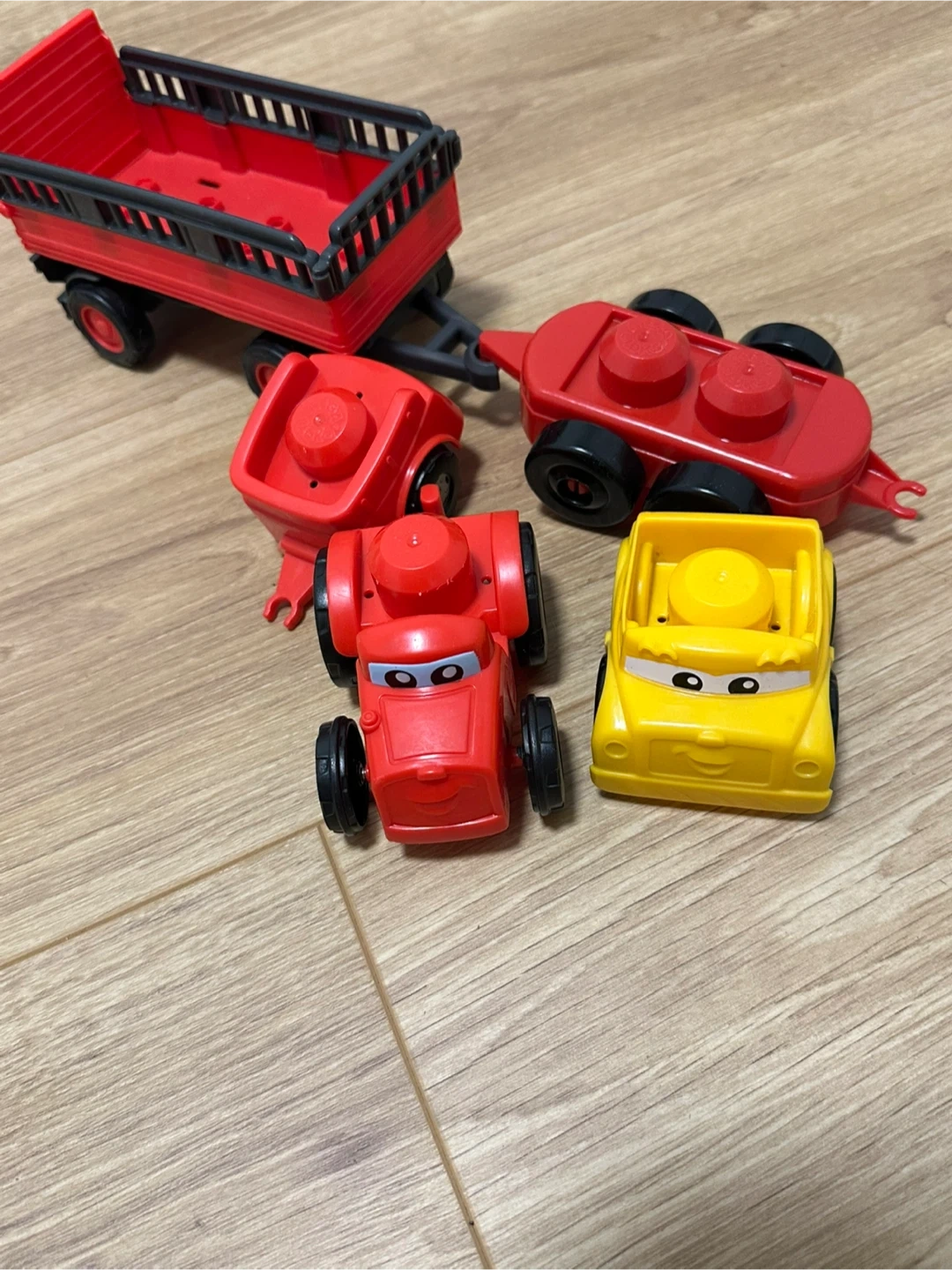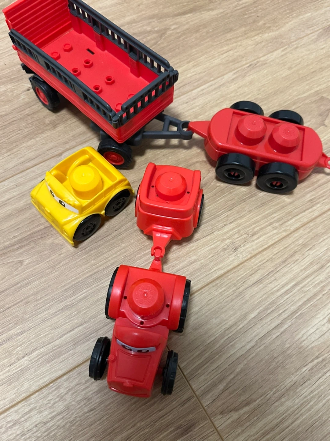 A cute set of toy cars and a trailer, perfect for little ones who love vehicles! The set includes a red trailer and several colourful cars.