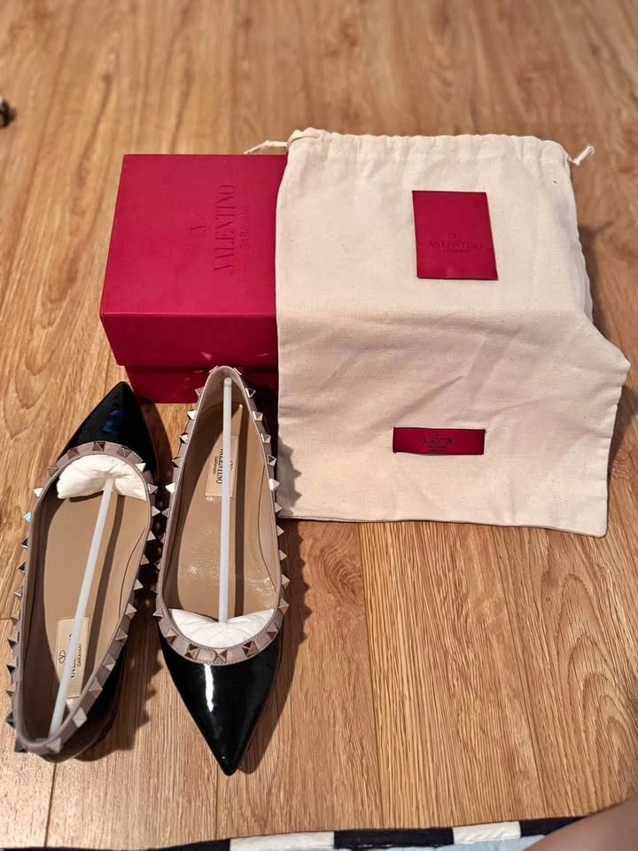 Valentino Garavani Rockstud ballerina in patent leather. Platinum-finish studs. Pre-loved condition. With original box with duster and stuffing. Comes with extra studs.