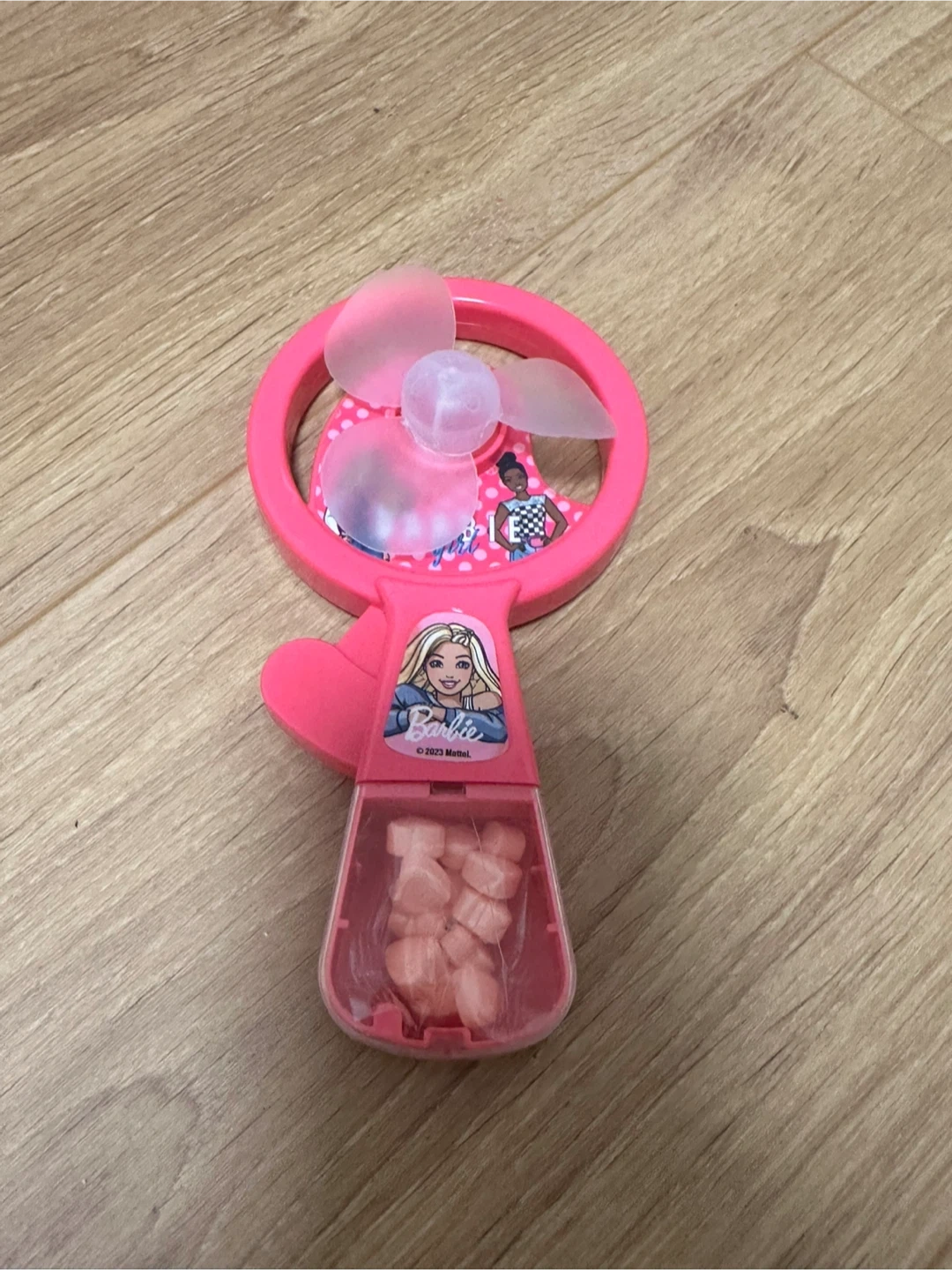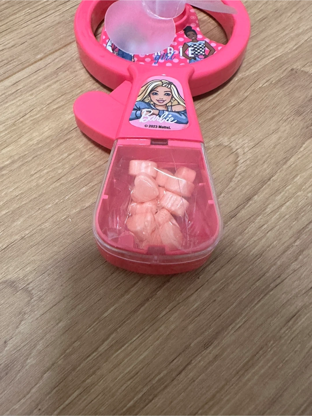 Selling a cute Barbie candy fan! It's pink and comes with heart-shaped candies inside. Perfect for a little treat and a fun way to cool down on a warm day