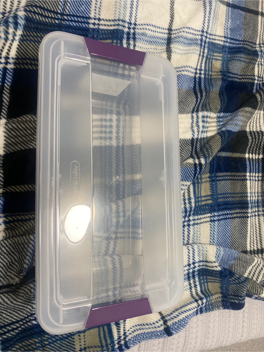 Selling a Sterilite clear storage box. It has purple latches to keep everything secure. Great for organizing your things! Pick up cash only