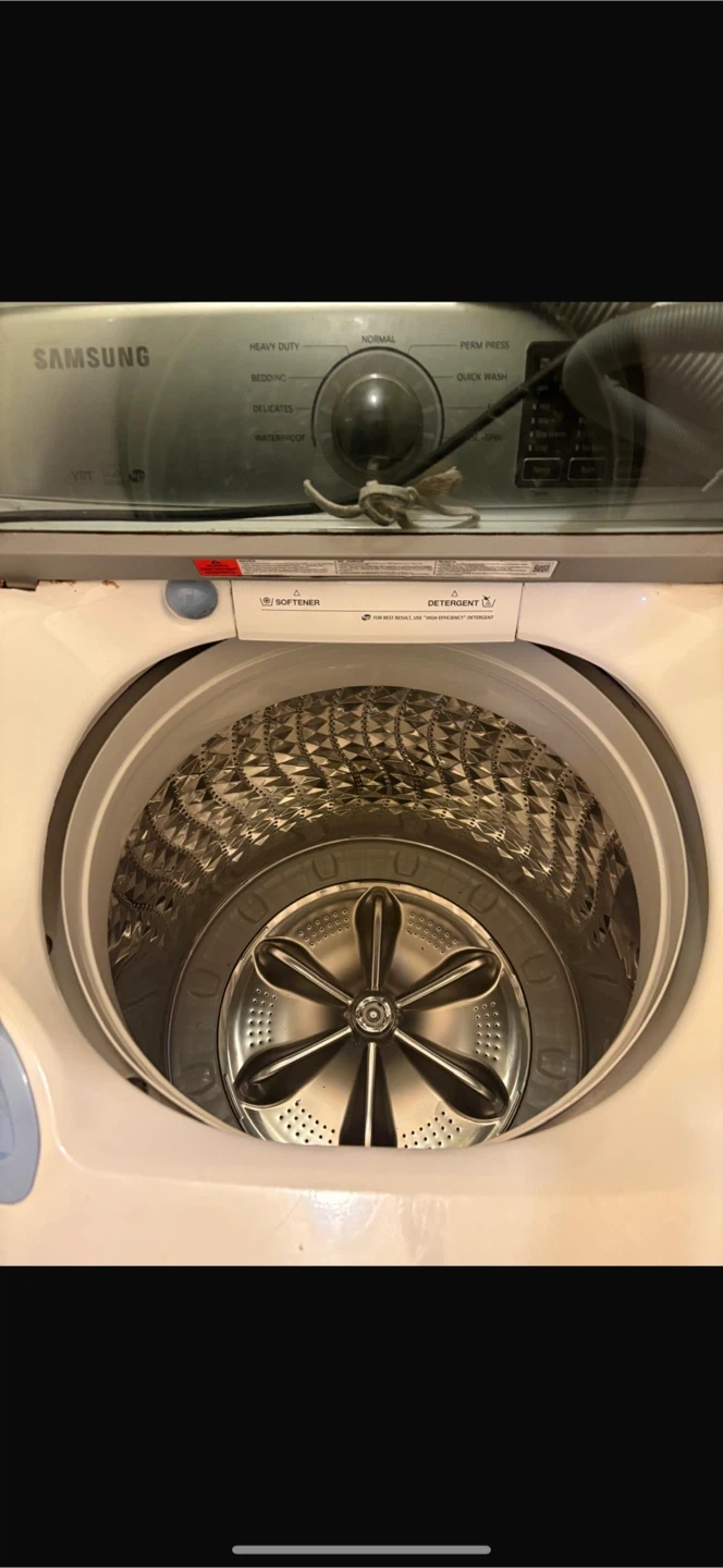Selling a Samsung top-load washing machine. It has settings for heavy duty, bedding, delicates, waterproof, normal, perm press, quick wash, and more!