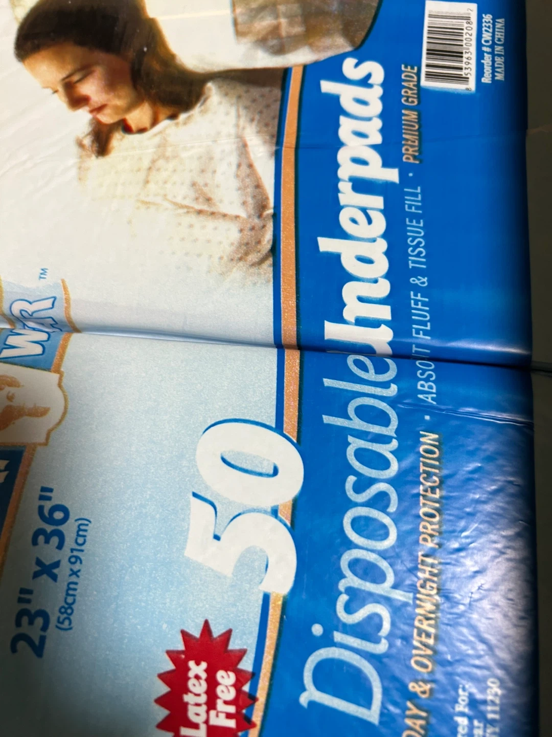 Selling Comfort Wear Disposable Underpads. Each pad measures 23" x 36" (58cm x 91cm). There are 50 pads in each pack. These underpads offer day and overnight protection with absorbent fluff and tissue fill. They are latex free