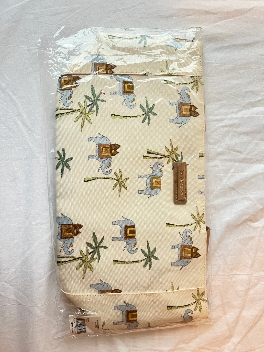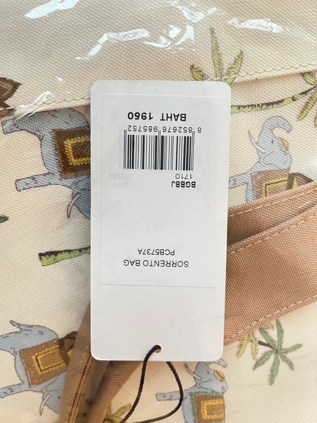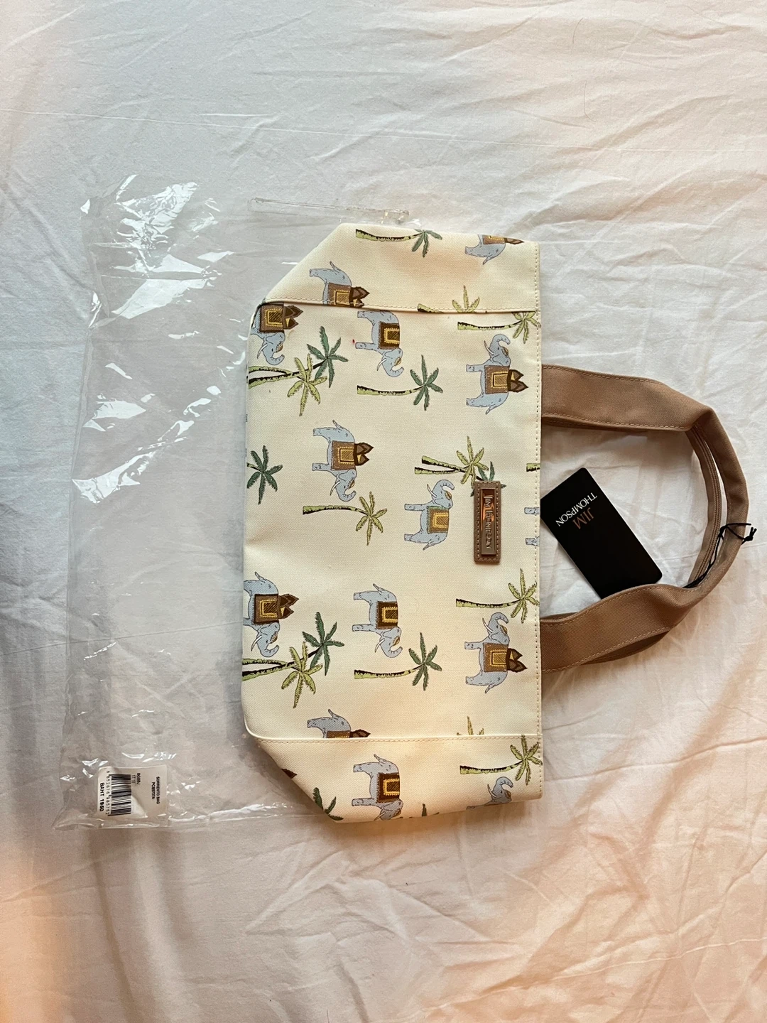 This Jim Thompson Sorrento Bag is brand new and still in its original packaging! It features a charming elephant and palm tree pattern on a cream-colored background. Perfect for adding a touch of whimsy to your everyday style