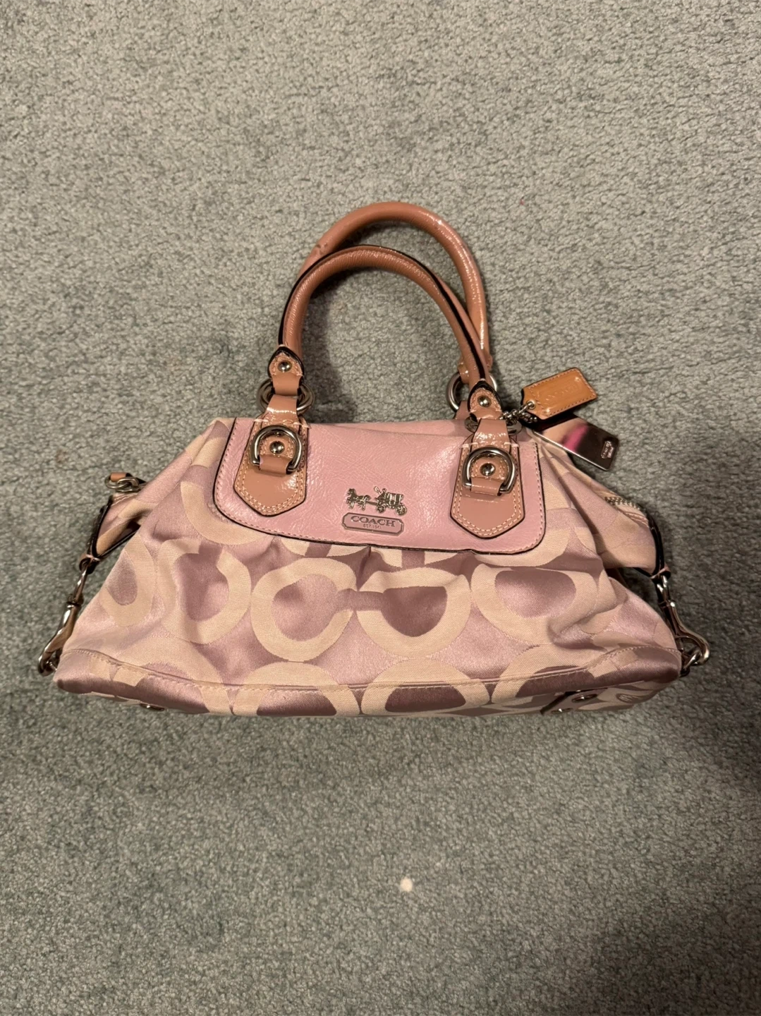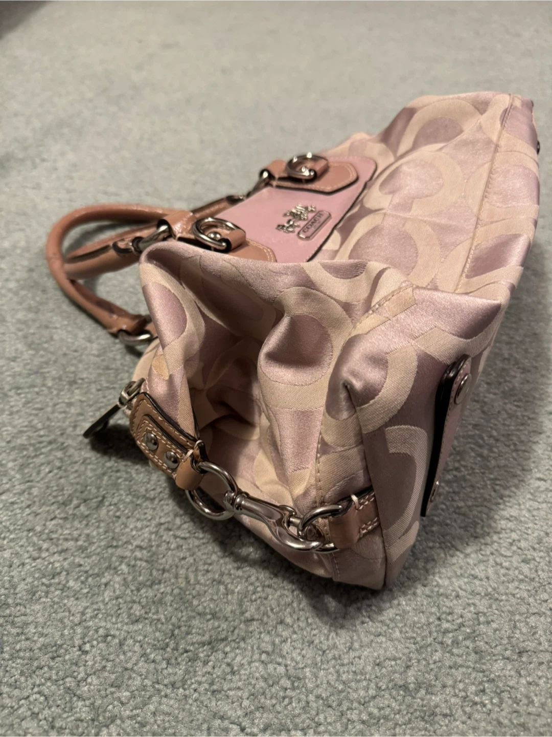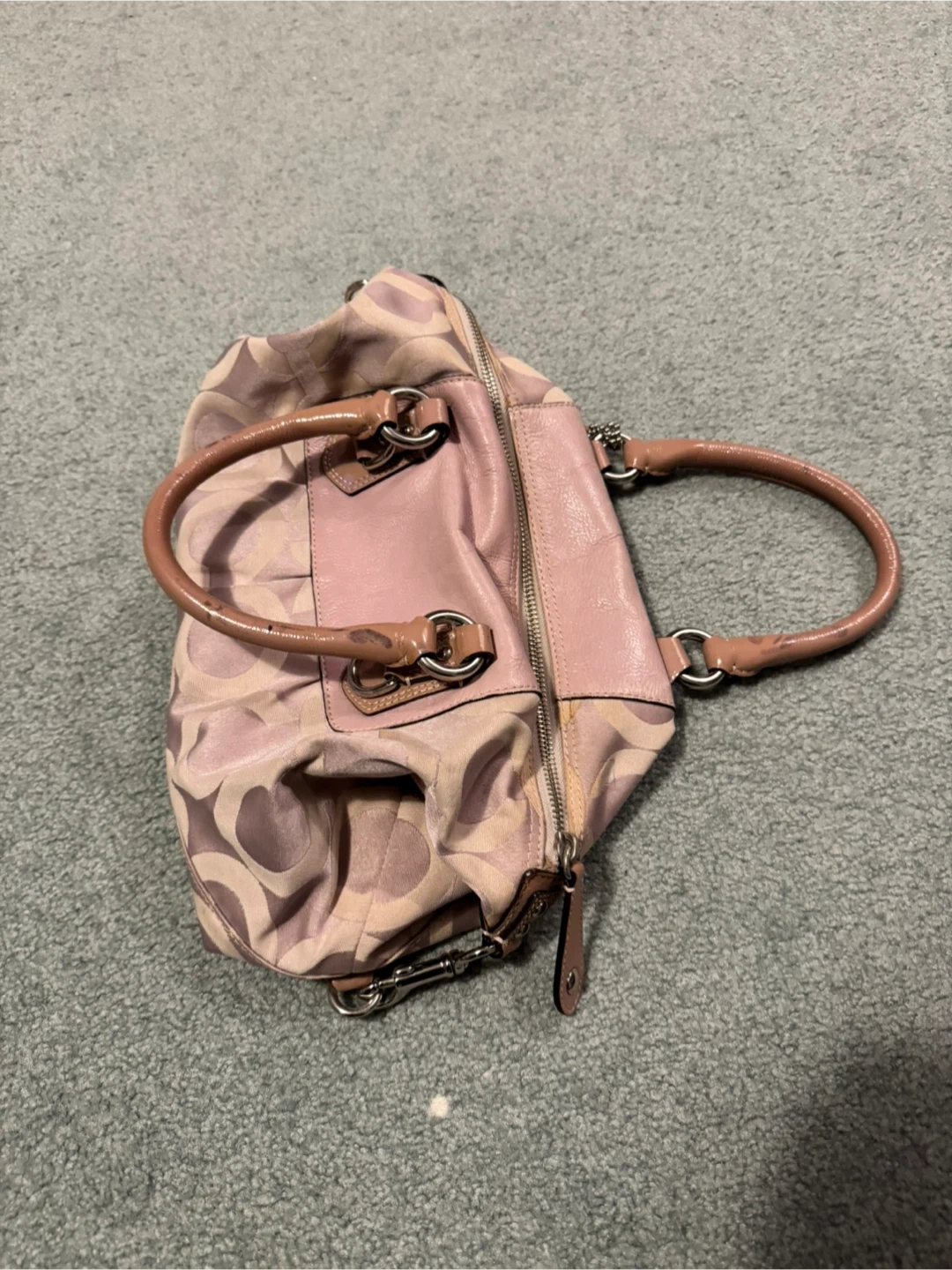 Selling a cute Coach satchel handbag. It's in good condition and has a fun, patterned design. Perfect for everyday use! Some marks on the inside of the handles as shown in the image