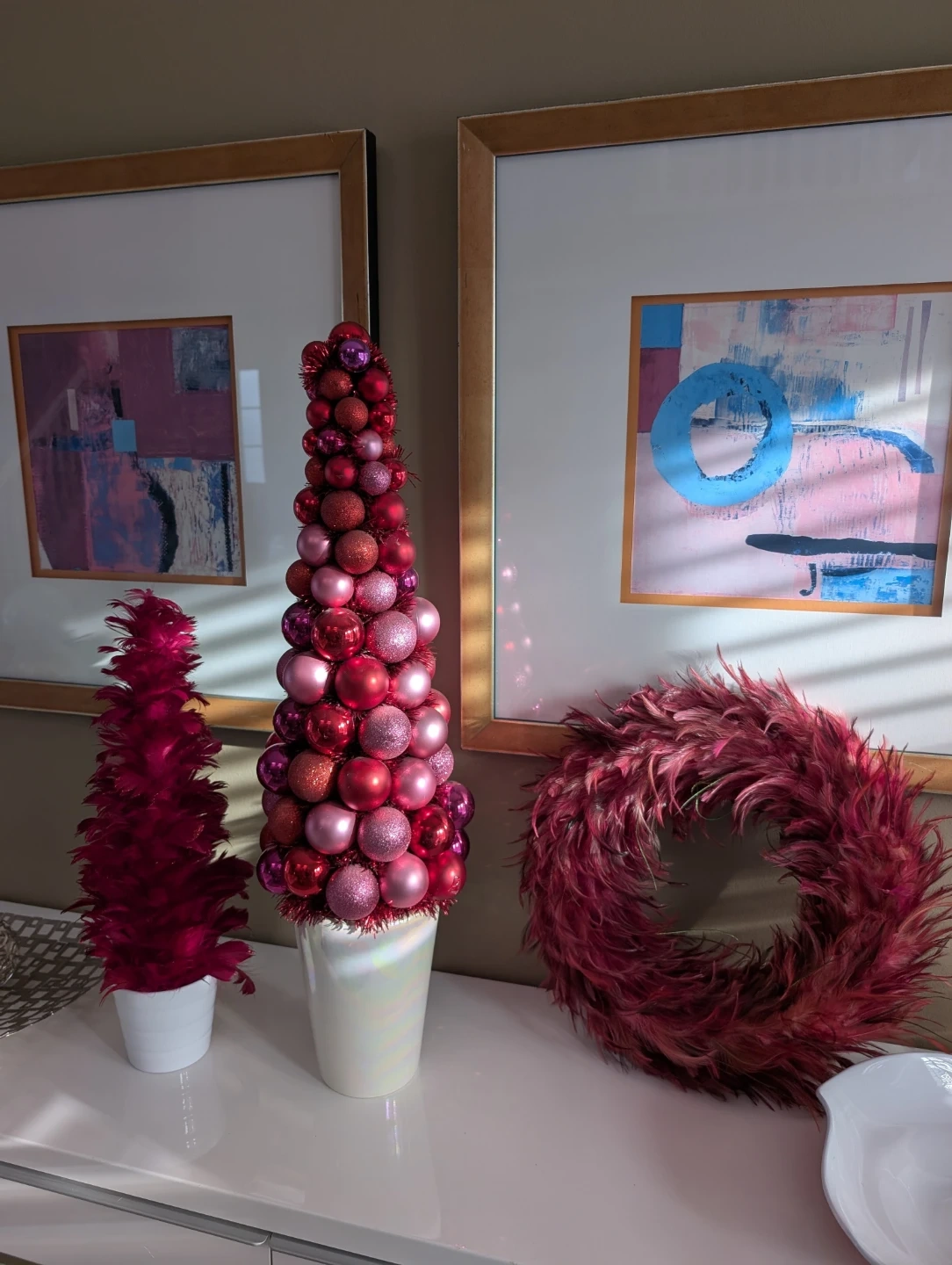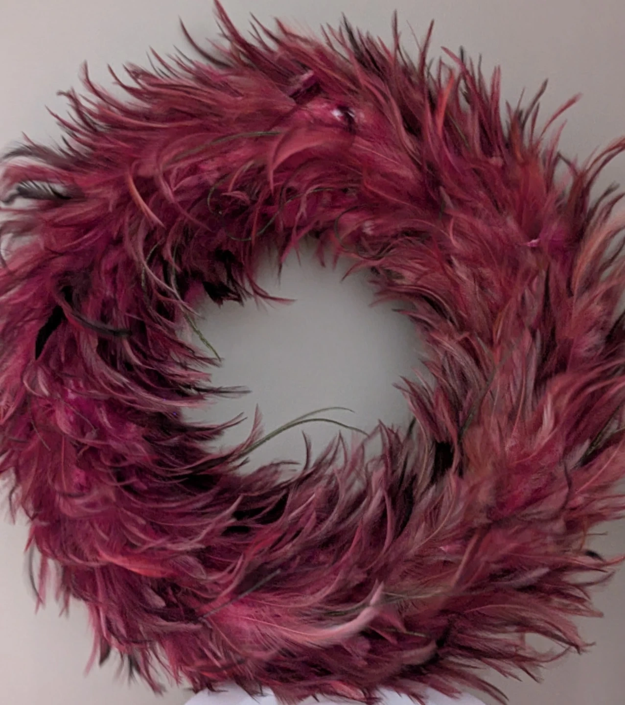 Beautiful feather wreath in soft pink and fuchsia tones. Very pretty all year round, but especially going into February for Valentine's Day themed decor. I often used it at Christmas, but kept it up long term for its beauty.