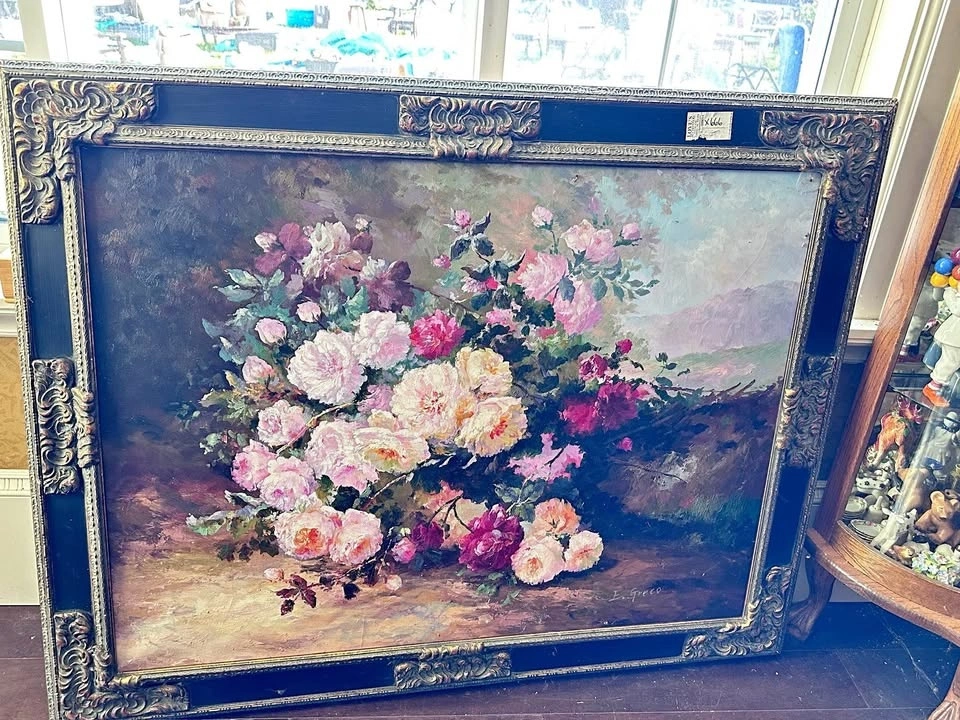 This vibrant artwork showcases a lush bouquet of roses rendered with rich, textured brushstrokes against a soft pastoral backdrop. Framed in an elaborate, antique-style frame, it brings classic romantic charm to any traditional or decorative setting.