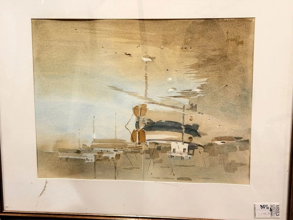 Soft, atmospheric watercolor composition in muted beige, blue, and earth tones. Abstracted architectural and horizon elements create a calm, minimalist feel. Presented with a wide white mat and simple frame; ideal for modern or neutral interiors. Condition consistent with age and display.
