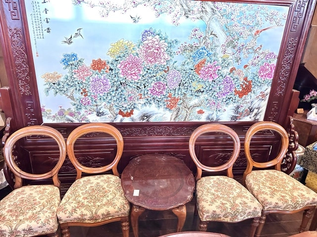 $600 for 5 chairs (50cm * 45cm * 90cm). Set of vintage oval-back wooden chairs featuring ornate carvings and floral tapestry upholstery. For sale by owner.