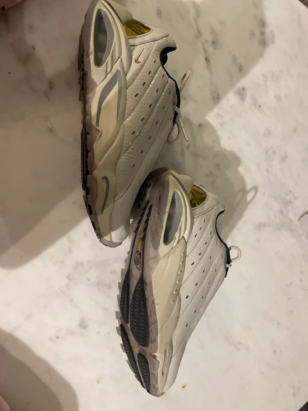 Nike x Nocta 'Hot Step Air Terra' Sneakers in monochromatic white leather colourway with perforated detailing, gold metallic dealing and a round toe. Features front lace-up fastening, rubber sole and a signature swoosh logo detail.
