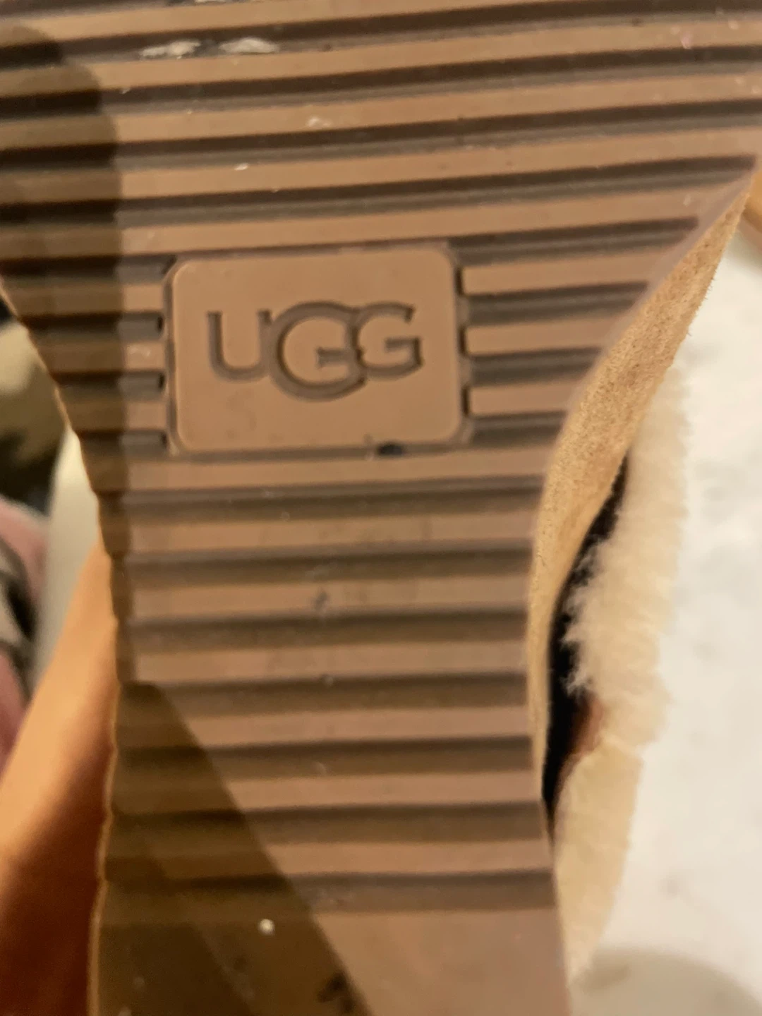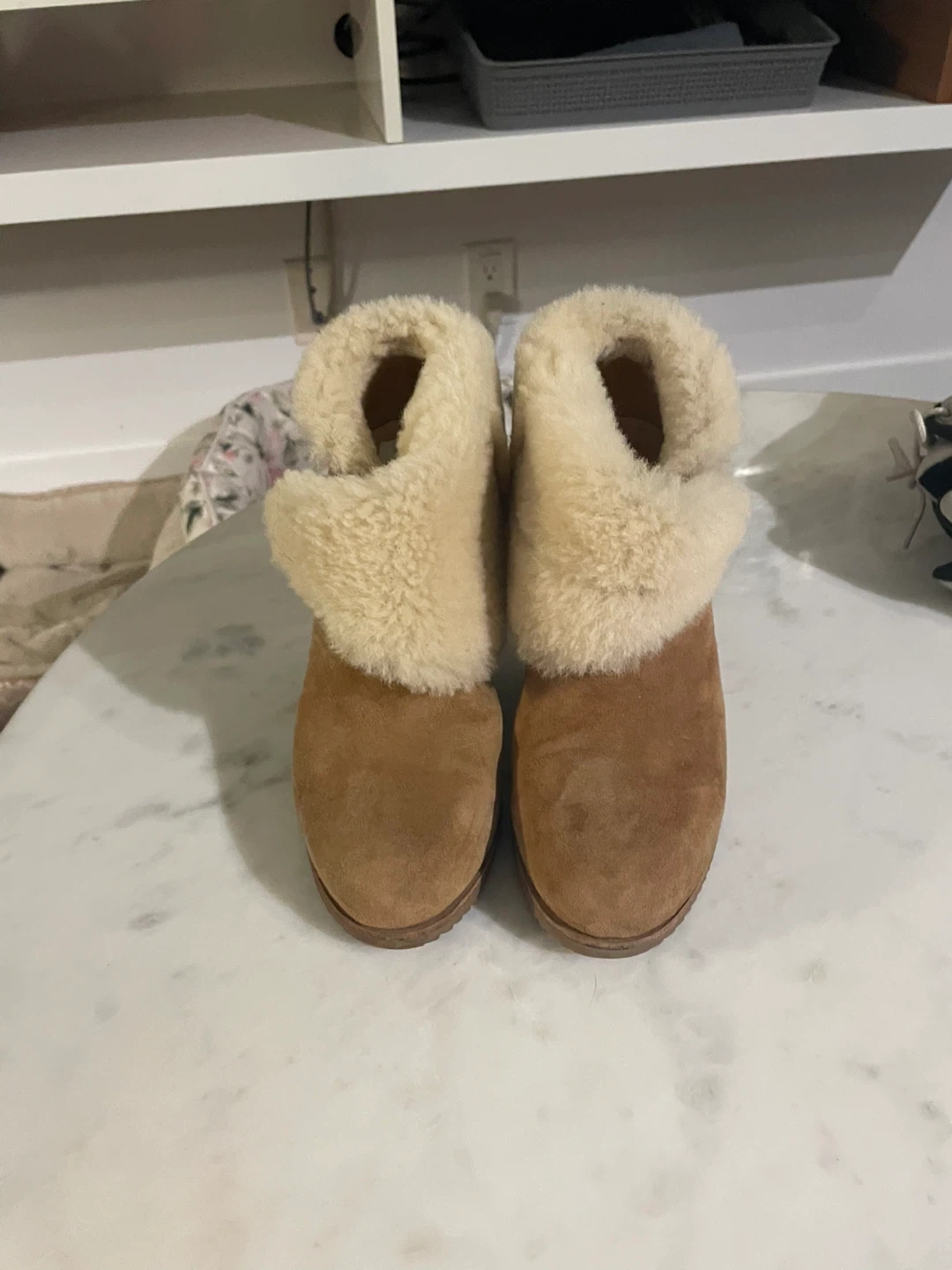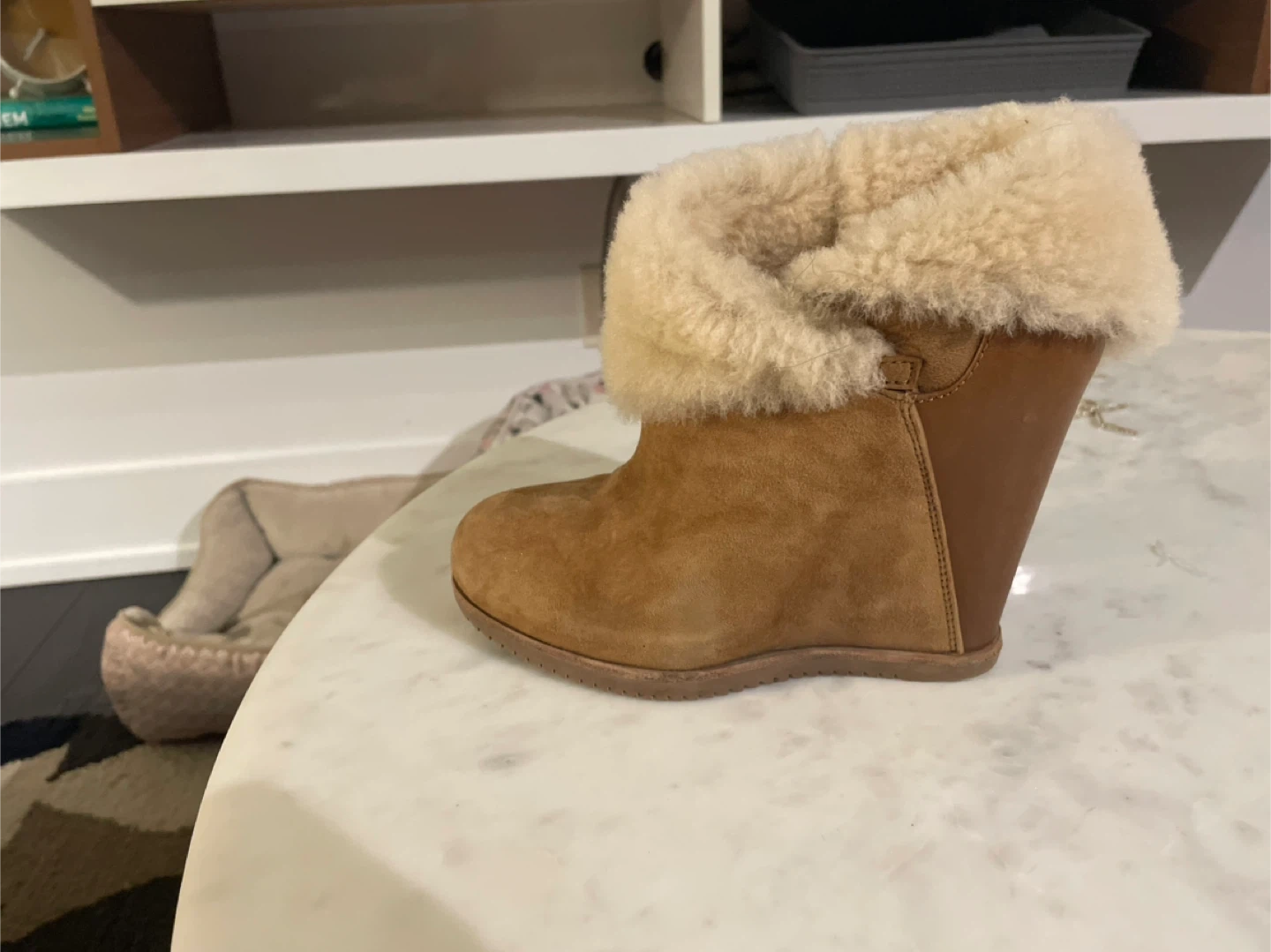 Cozy up with these stylish UGG boots! They're a lovely brown suede with a comfy wedge heel and soft, plush lining. Perfect for adding a touch of warmth and styleo to your outfits this season SIZE 5. ALSO SELING FOR$35