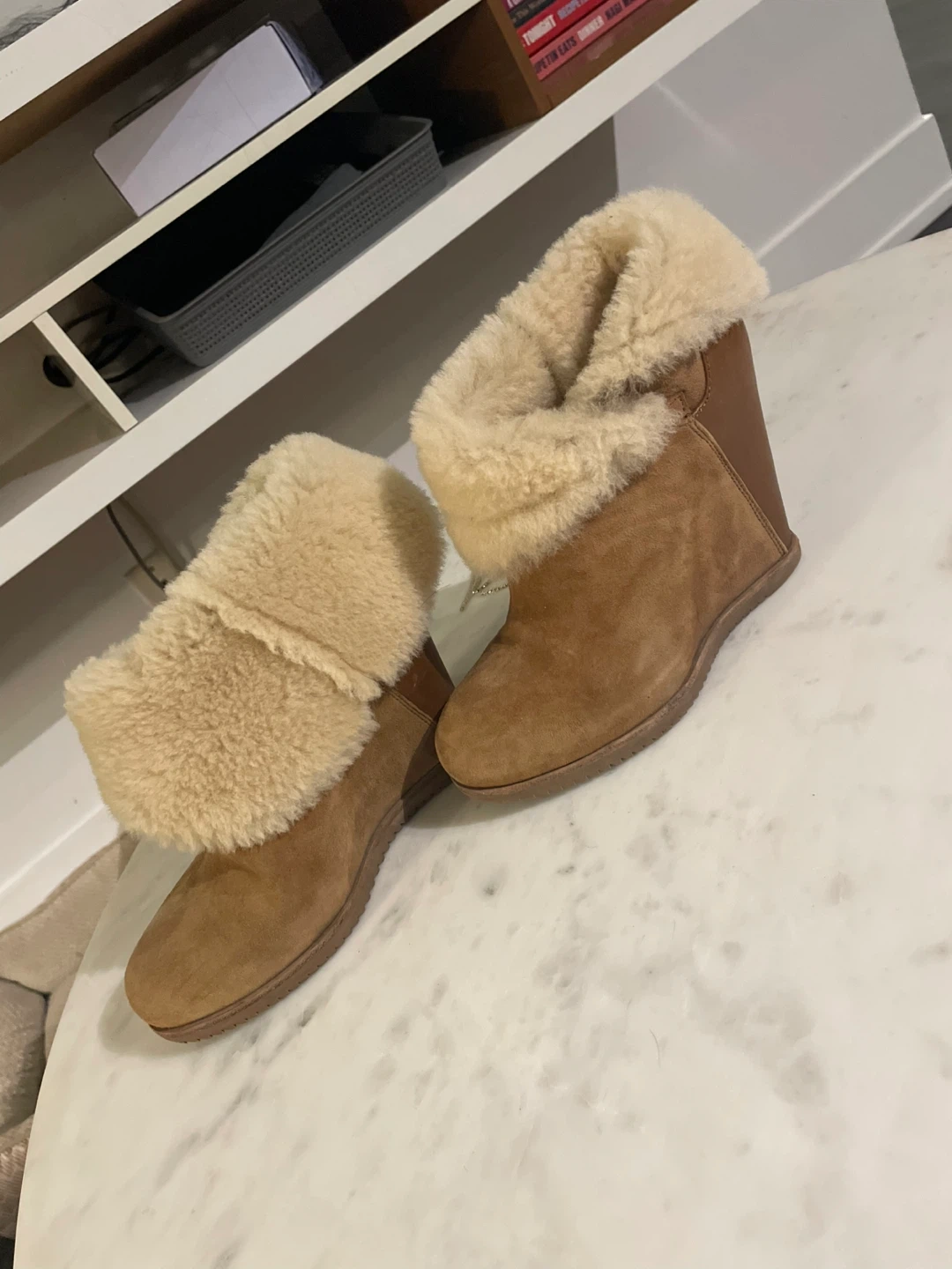 Cozy up with these stylish UGG boots! They're a lovely brown suede with a comfy wedge heel and soft, plush lining. Perfect for adding a touch of warmth and styleo to your outfits this season SIZE 5. ALSO SELING FOR$35