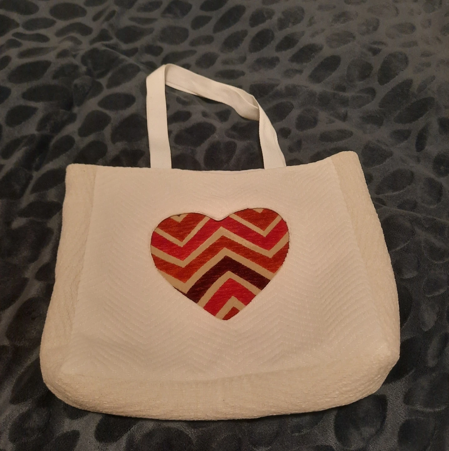 This white tote bag is my handmade, features a unique heart design with warm, inviting colours. It's perfect for shopping, carrying books, or just adding a little flair to your outfit or as a gift ๐