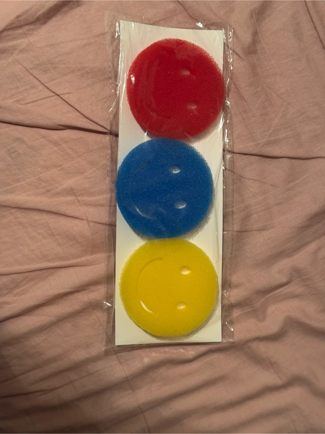 Selling a brand new 3-pack of smiley face sponges! They come in red, blue, and yellow and are still in their original packaging.