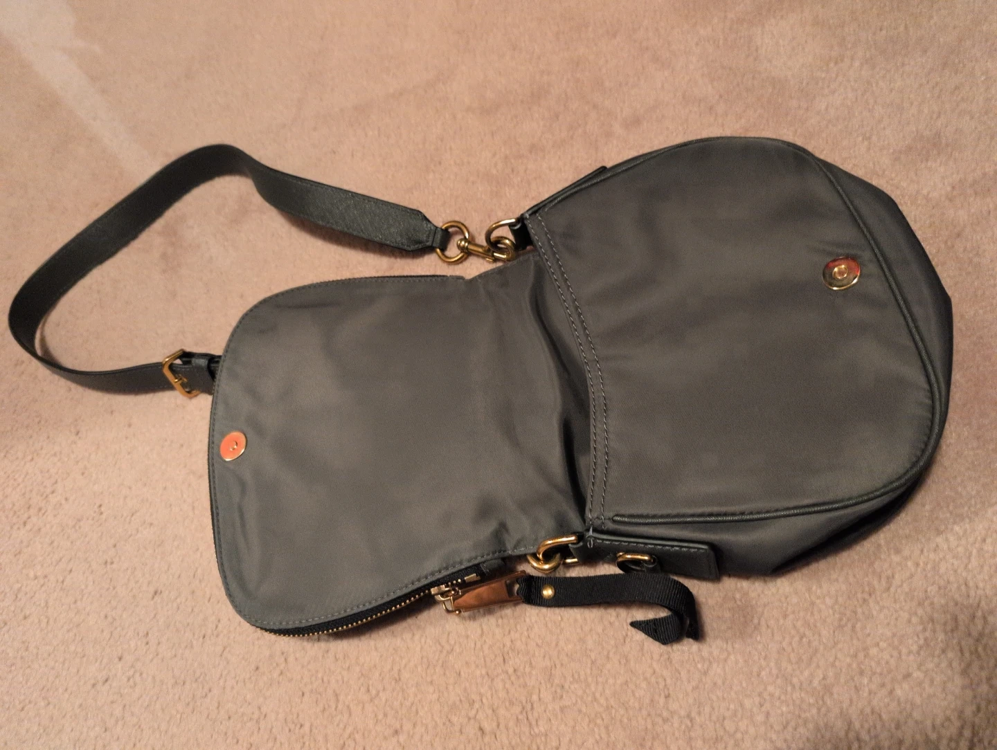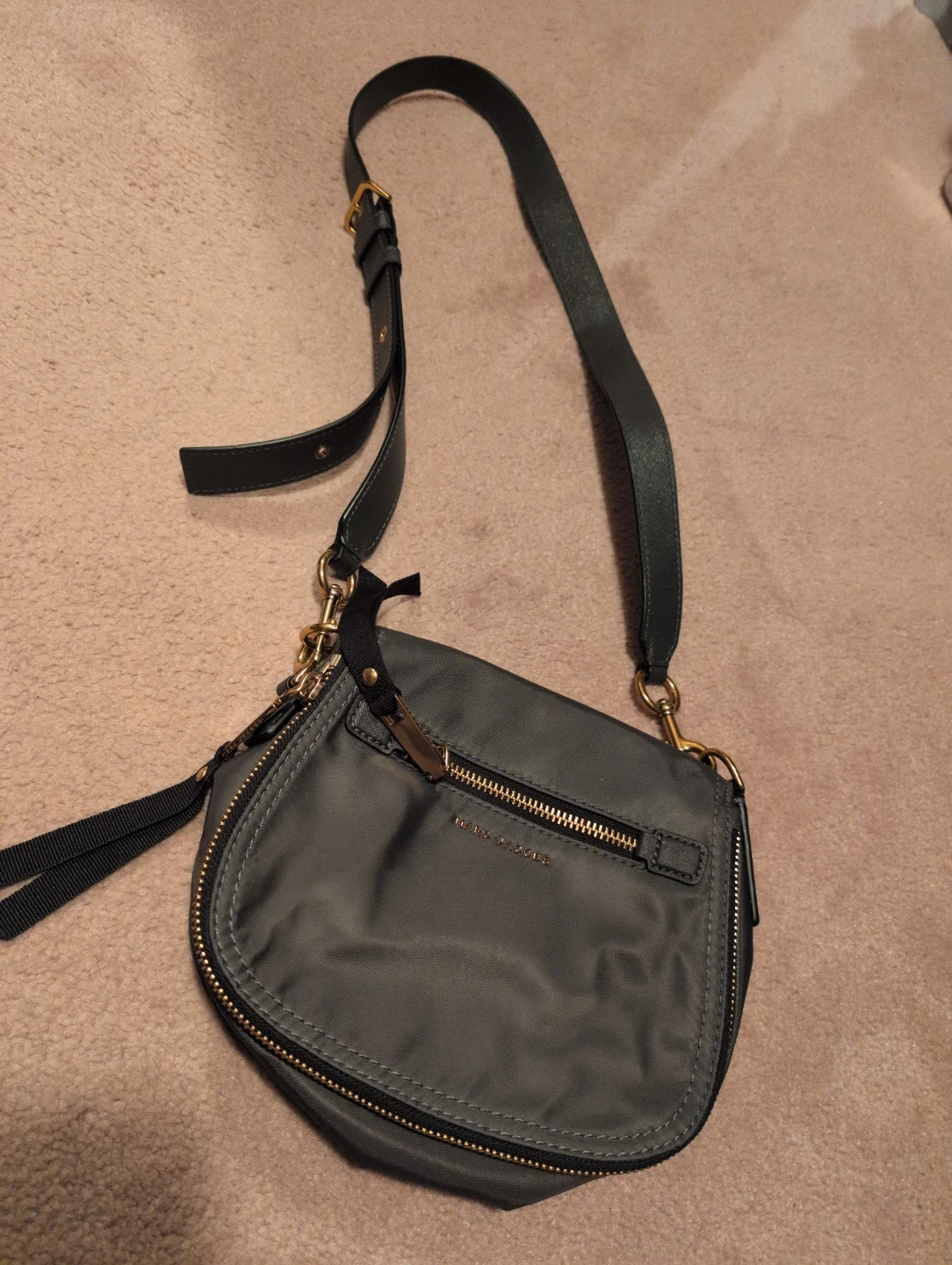 This is a Marc Jacobs grey nylon crossbody bag. It's in great condition and ready for a new owner! Perfect for everyday use or travel, it's lightweight and easy to carry.