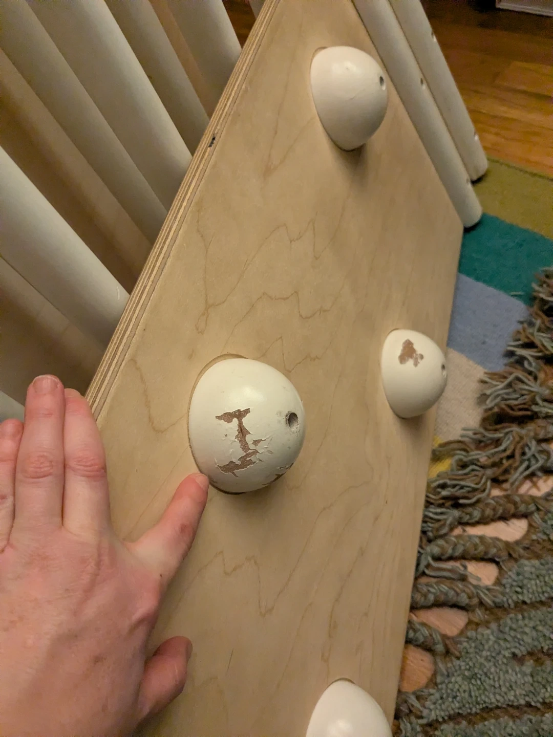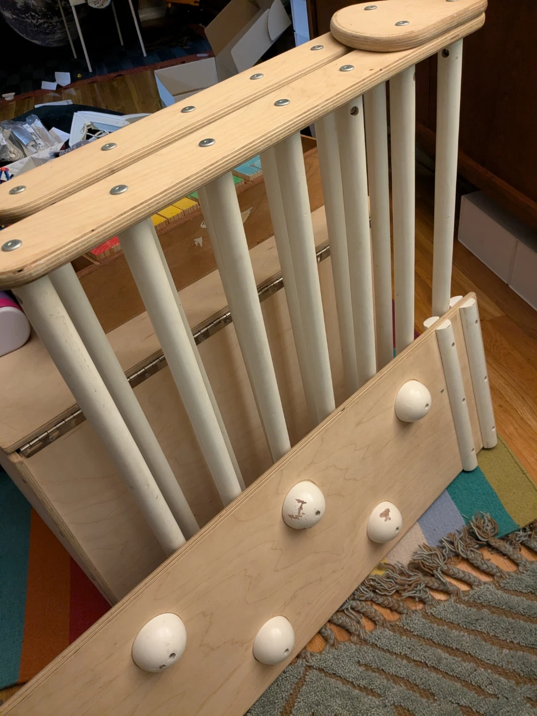 Need a wooden climbing gym for these cold winter months? Excellent even for pre-walkers-My daughter loved cruising on the slide leaned on her couch. The slide flips over with half globes/climbing wall. We are the second owners so there's so wear and tear.