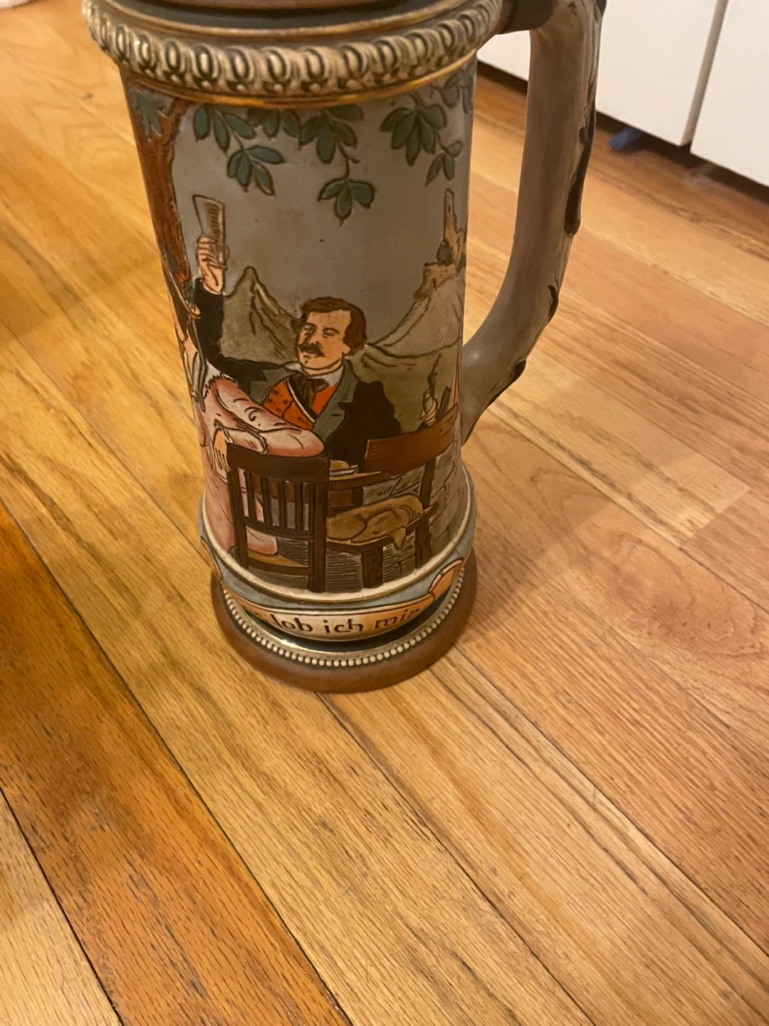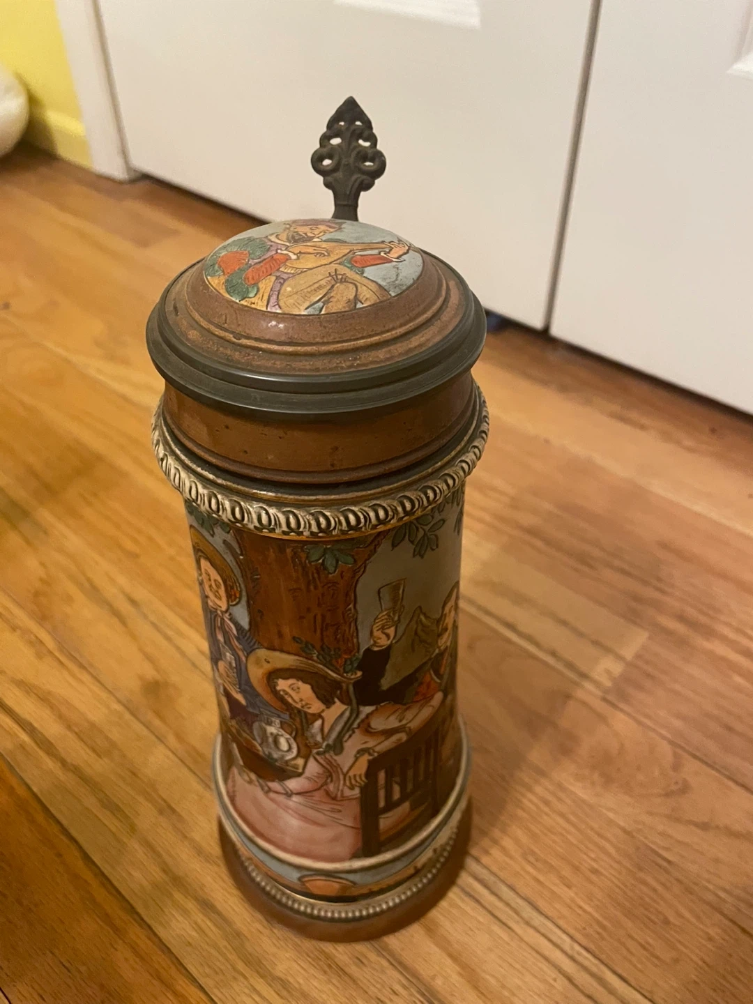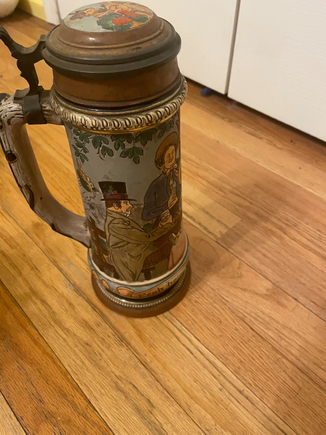 Selling a vintage German beer stein. It features a detailed design with people and scenes. The stein has a lid and a handle. It's in good condition for its age!