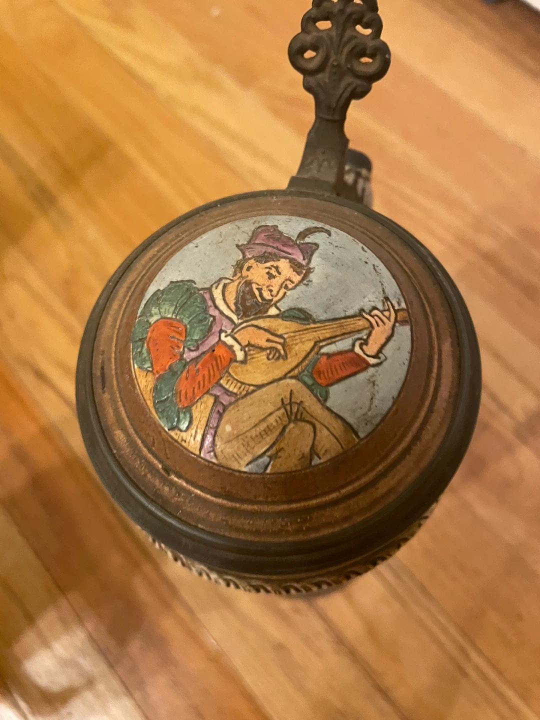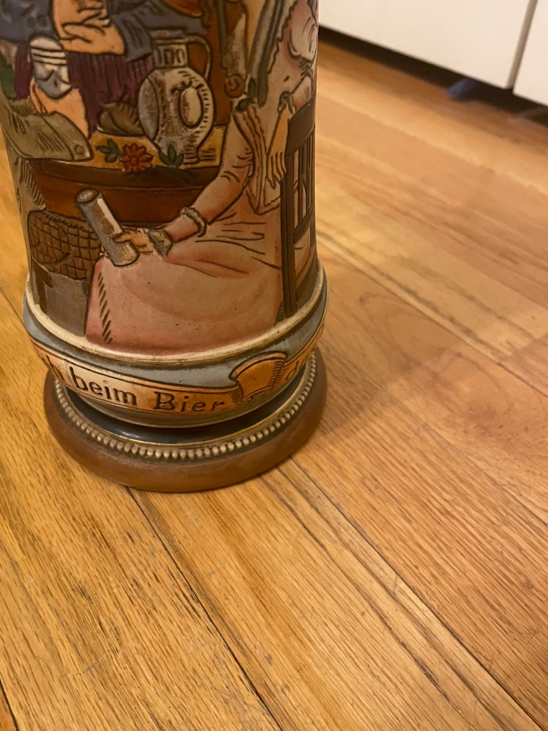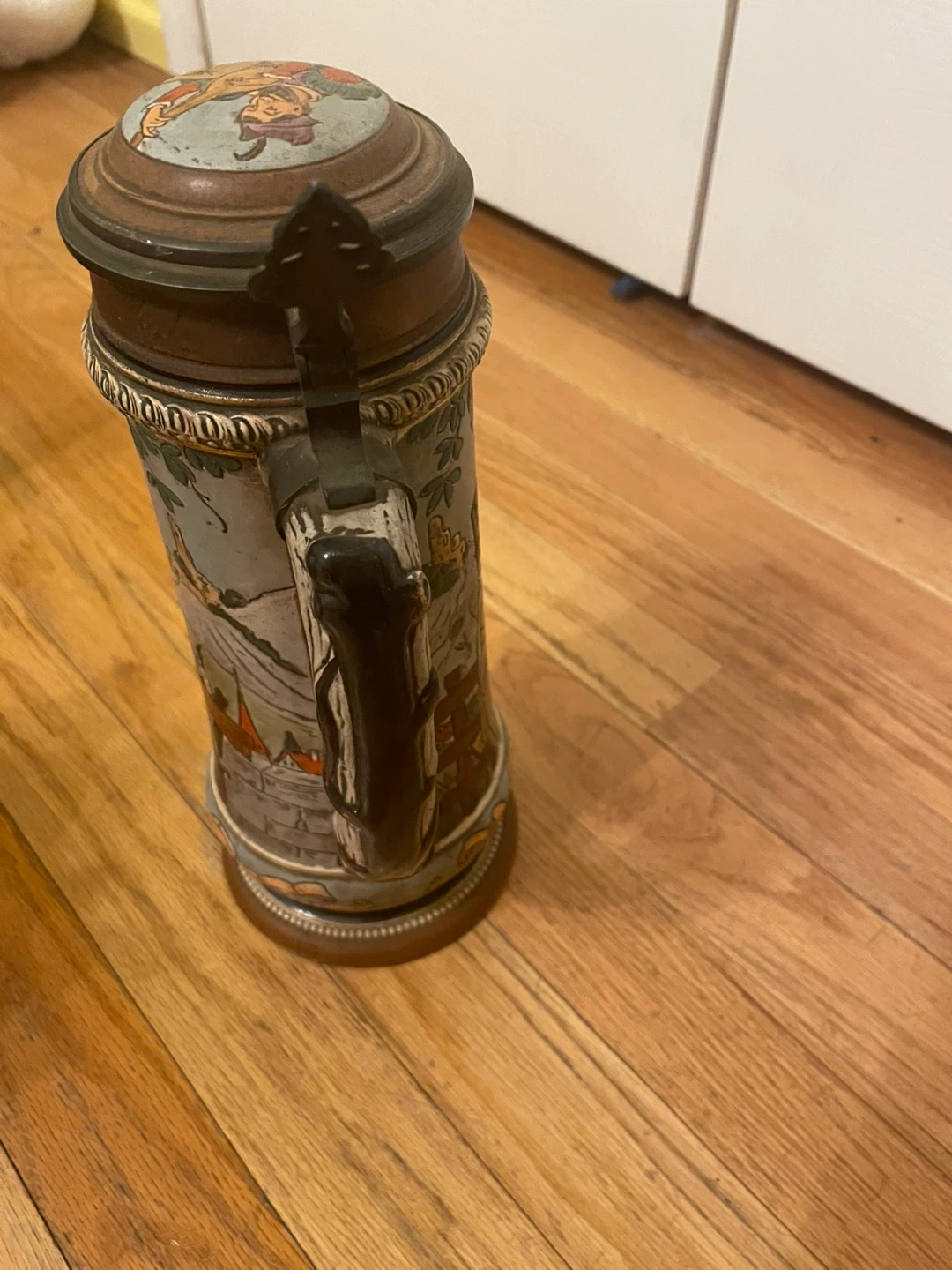 Selling a vintage German beer stein. It features a detailed design with people and scenes. The stein has a lid and a handle. It's in good condition for its age!