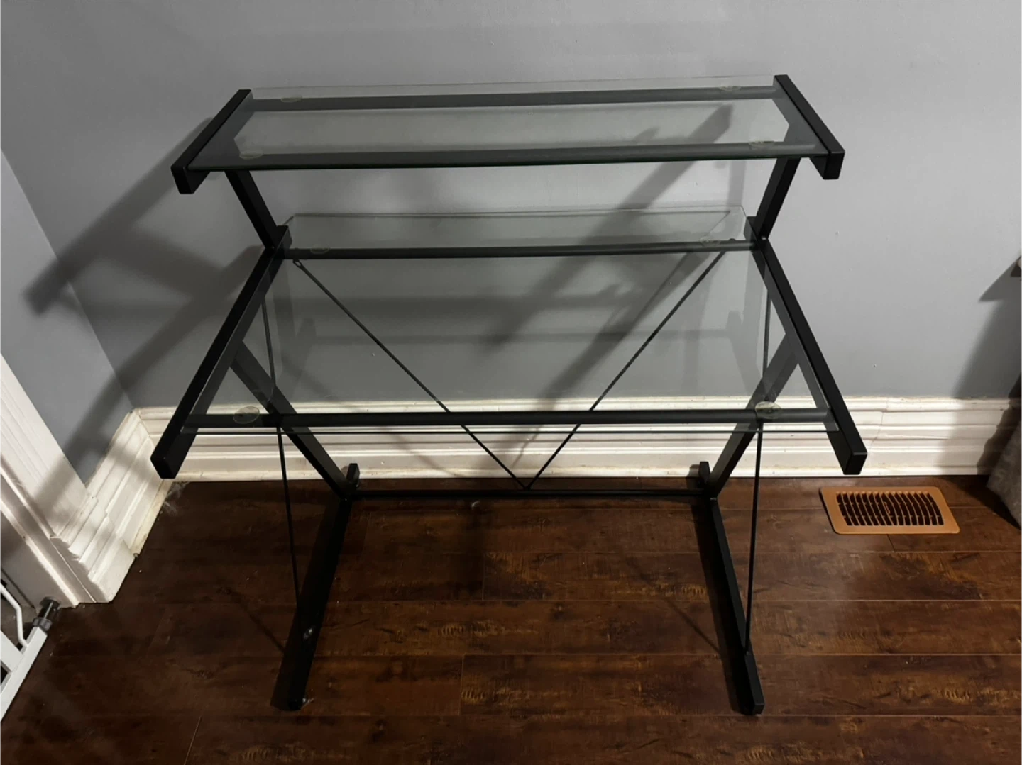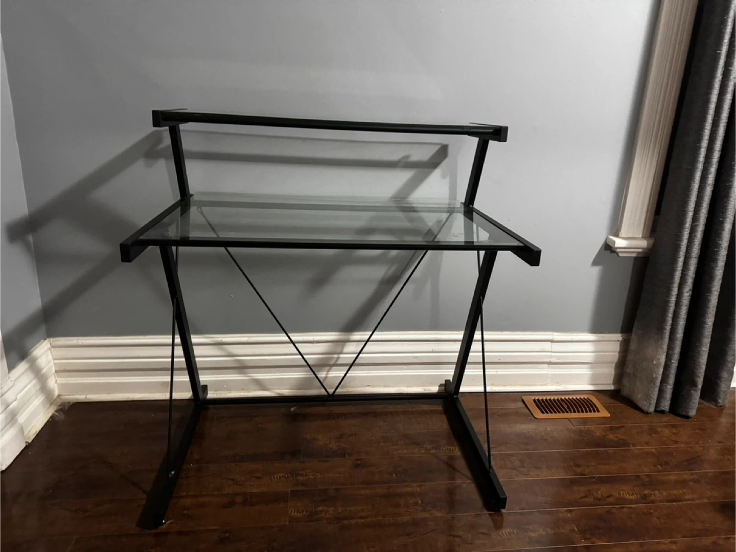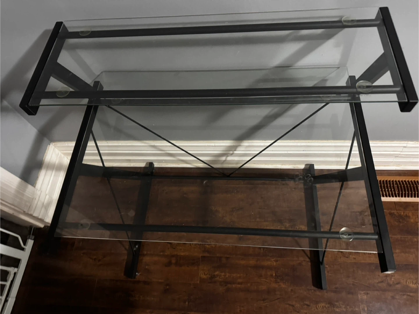 Selling a sleek black metal desk with a glass shelf. It's in great shape and would be perfect for a home office or studio setup. The design is simple and modern, fitting well into any decor! Missing a back screw to hold the cross section on but secured tightly with a black zip tie.