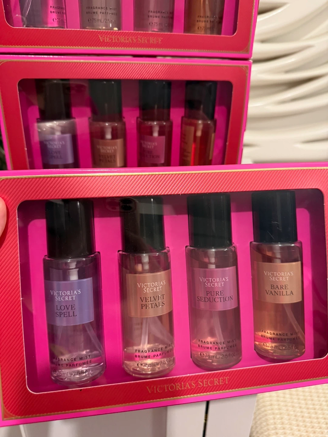 Selling a brand new Victoria's Secret fragrance mist set! This set includes four different scents: Love Spell, Velvet Petals, Pure Seduction, and Bare Vanilla. Each bottle contains 75ml/2.5 fl oz of fragrance mist. Perfect as a gift or to treat yourself!