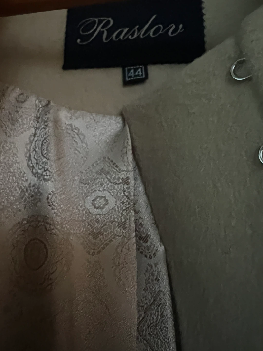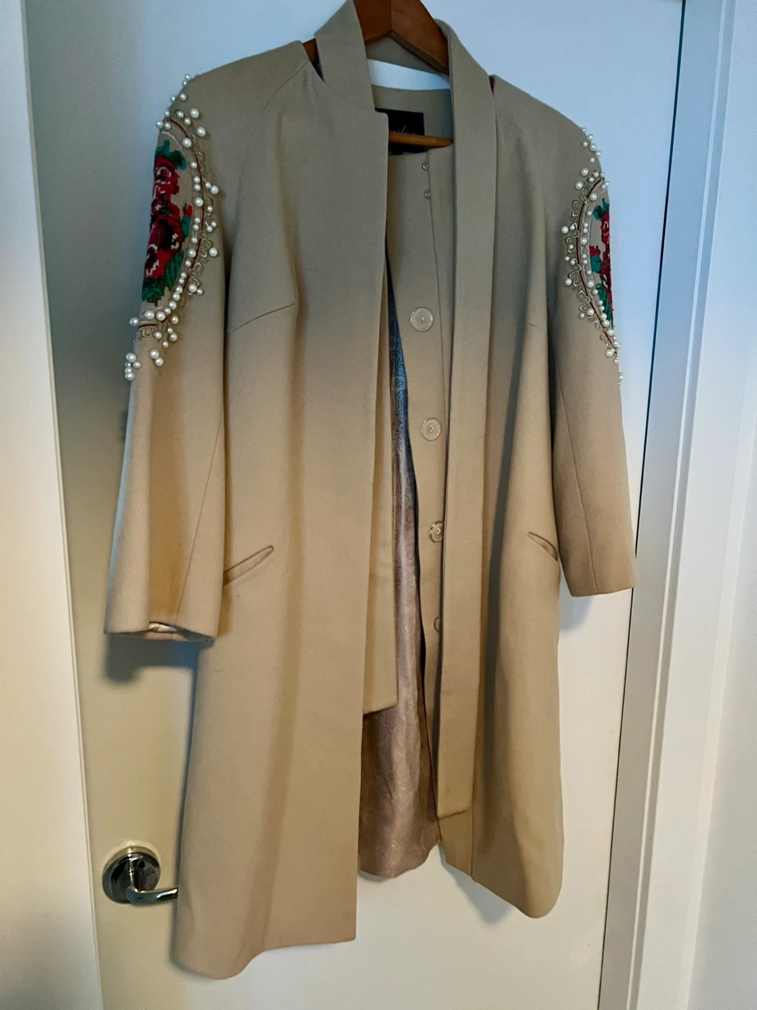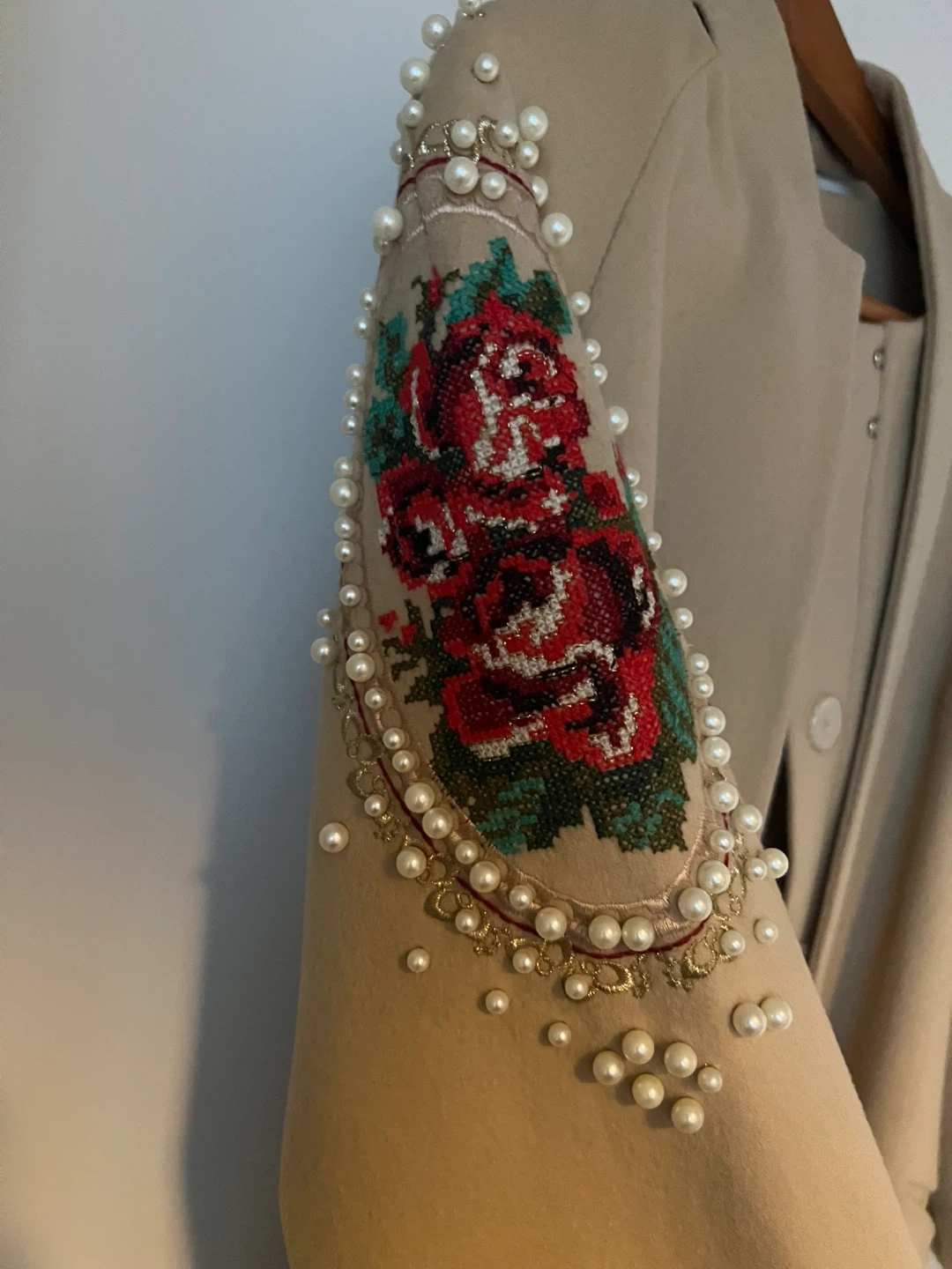 Selling beige coat in size 44. It features beautiful embroidery and pearl detailing on the sleeves. The coat has a unique design and is in good condition. Perfect for adding a touch of elegance to your wardrobe!