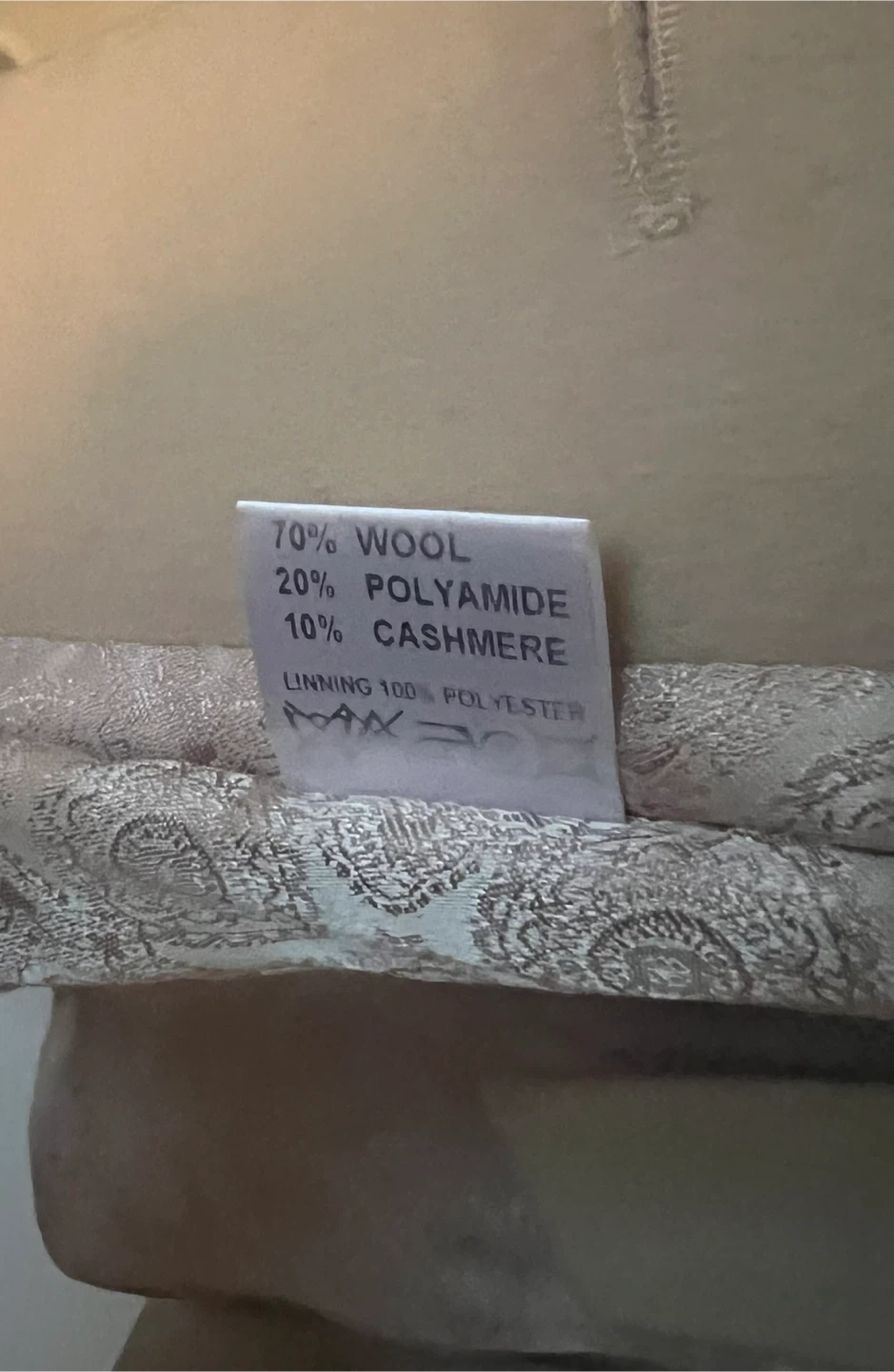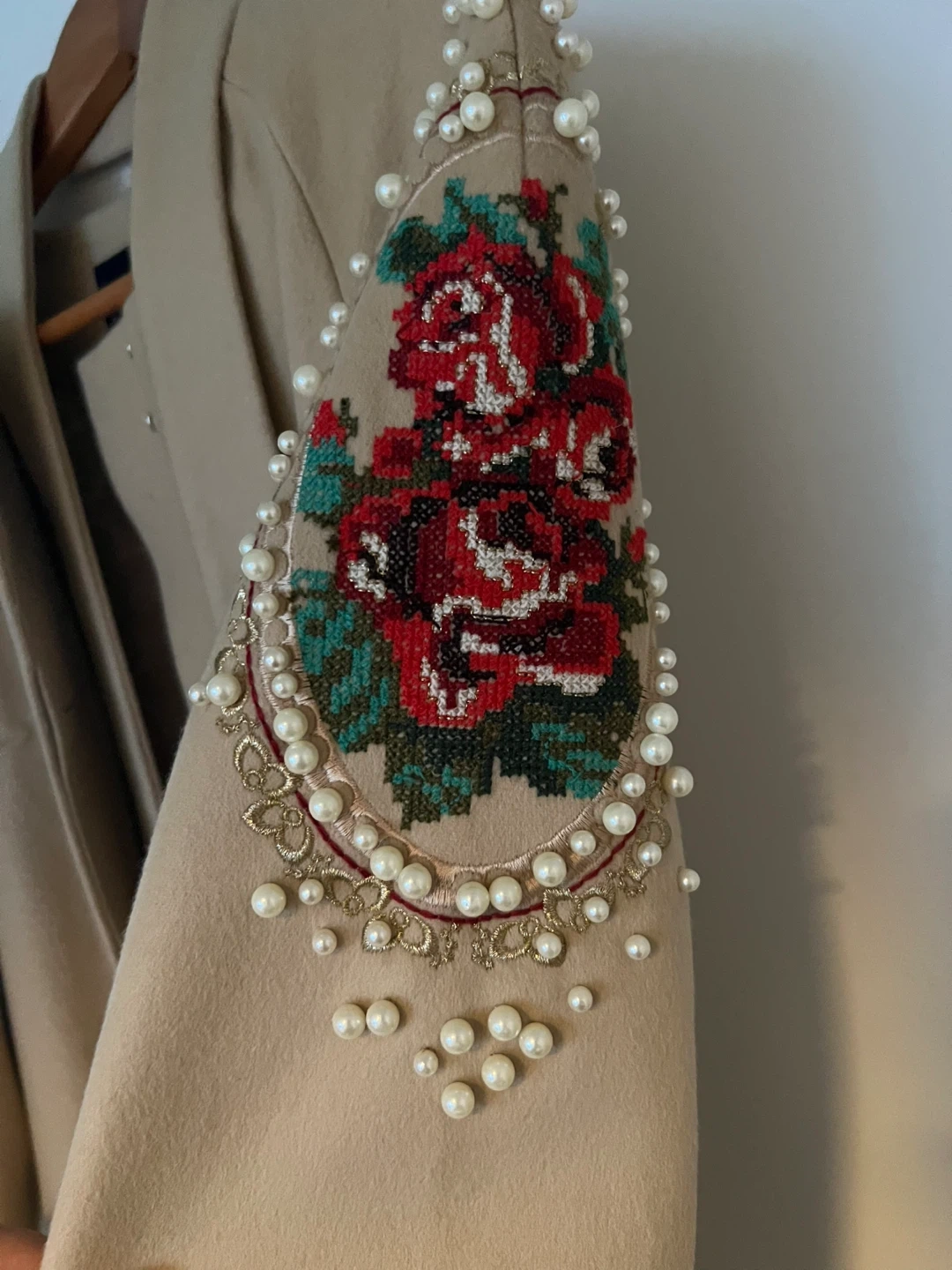 Selling beige coat in size 44. It features beautiful embroidery and pearl detailing on the sleeves. The coat has a unique design and is in good condition. Perfect for adding a touch of elegance to your wardrobe!